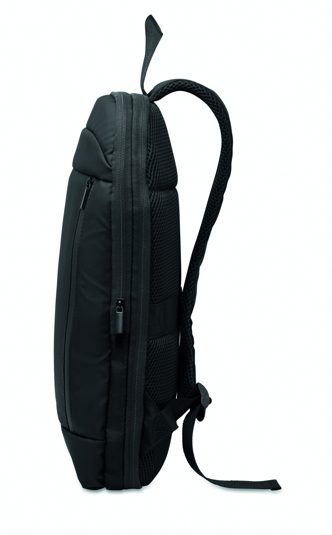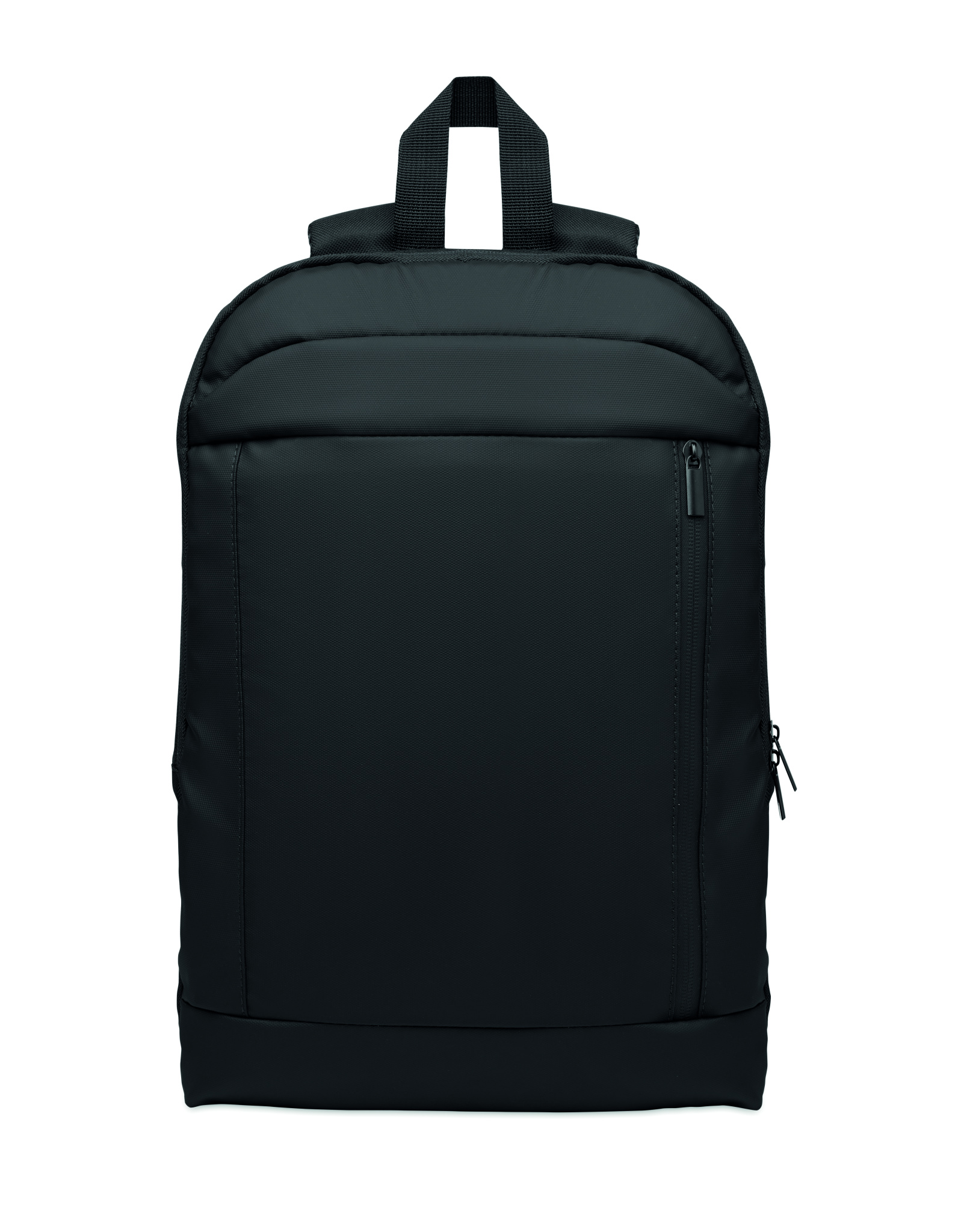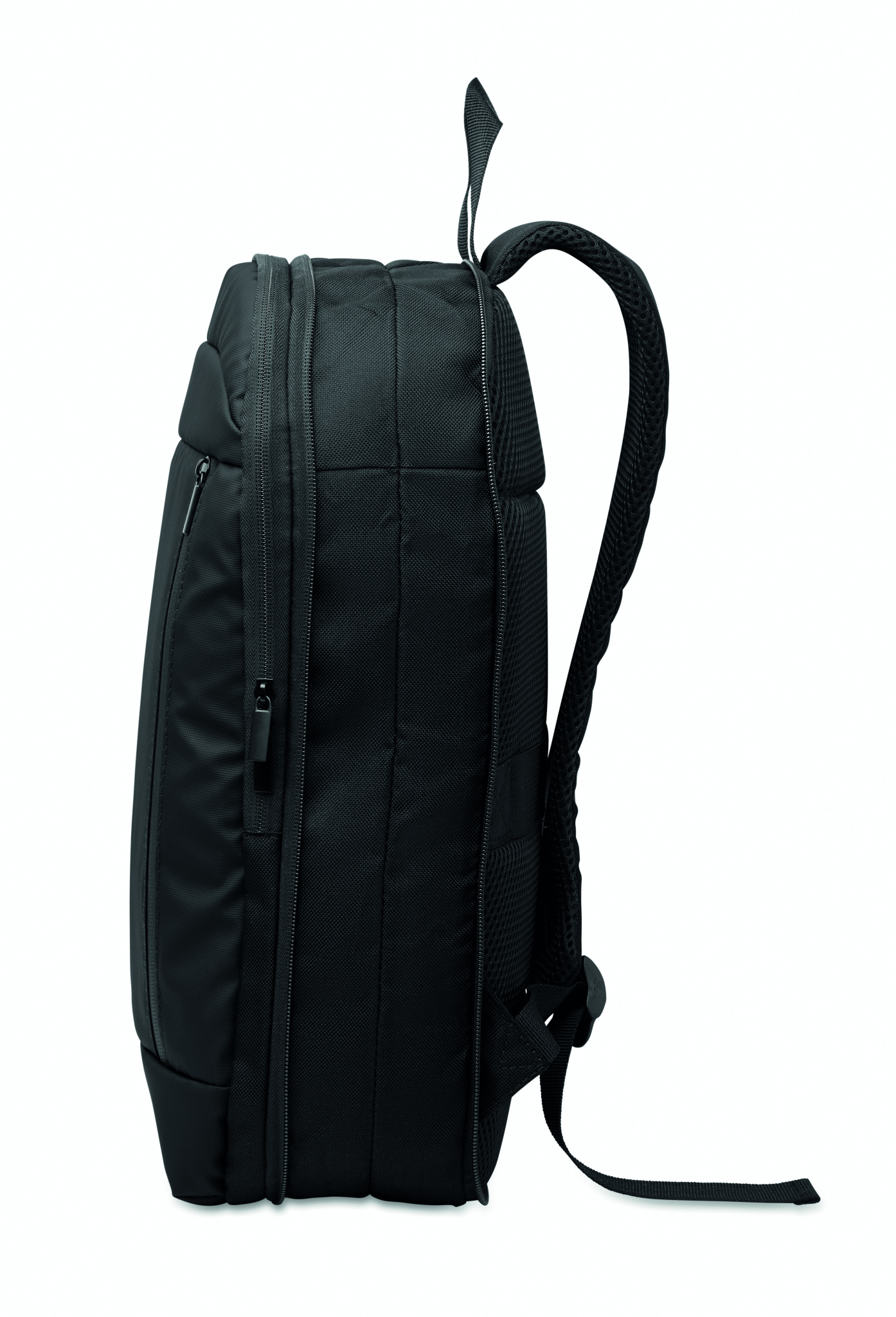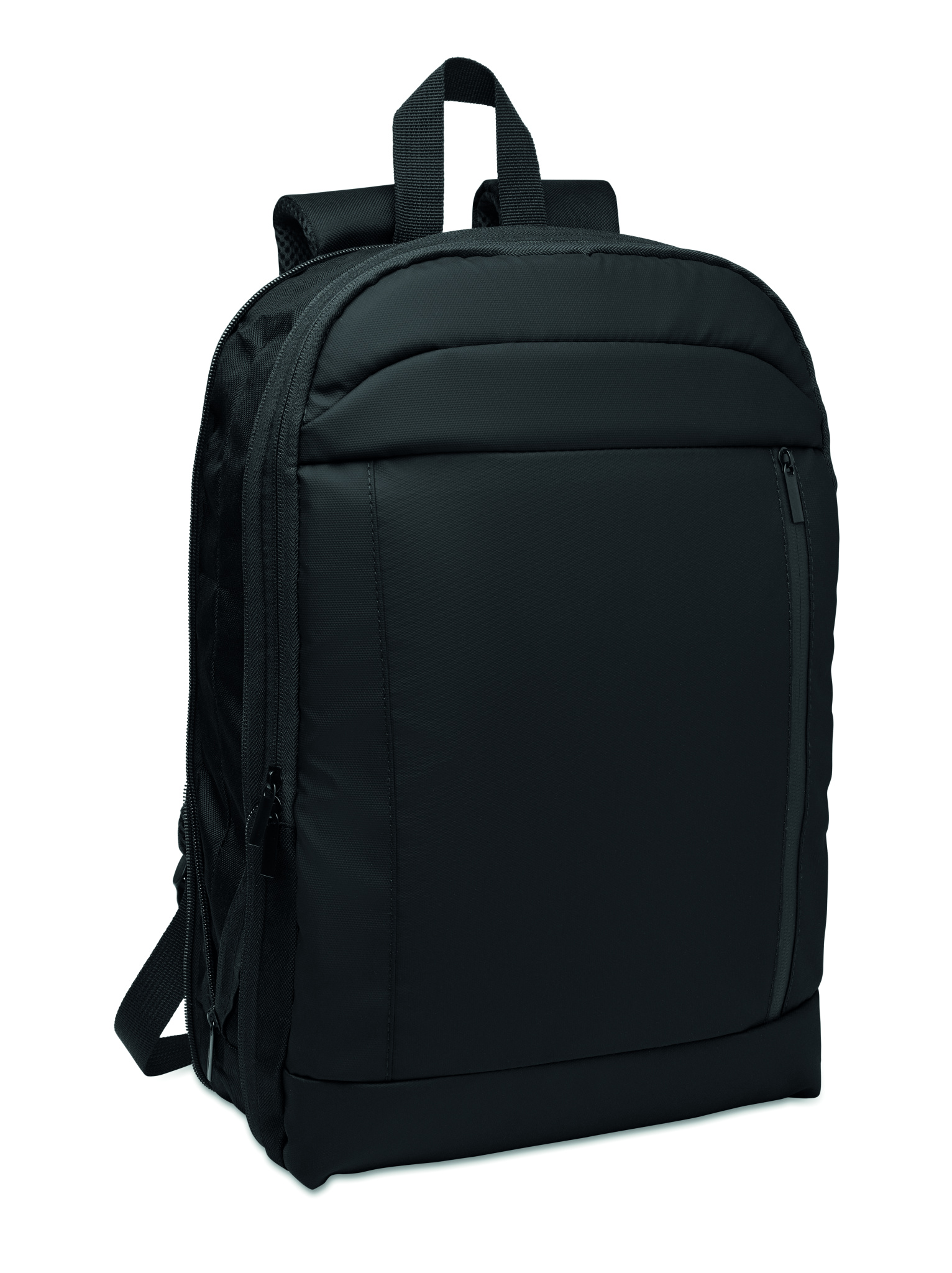 Erweiterbarer 16'' Laptop-Rucksack aus 600D RPET Polyester mit PU-Beschichtung. Gepolstertes Laptopfach, versteckte Reißverschlusstasche, Frontfach, Netzrücken und Trolley-Halterung. RPET-Polyesterfutter.