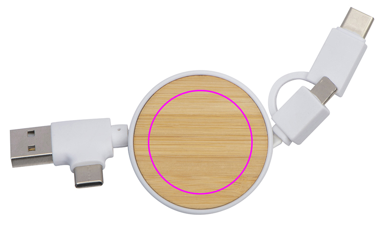 Verlängerbares Ladekabel im Kunststoffgehäuse mit Bambusplatte, USB, 2 C-Type und iOS-Adapter. Ihr Logo wird auf den Bambusteil gedruckt.