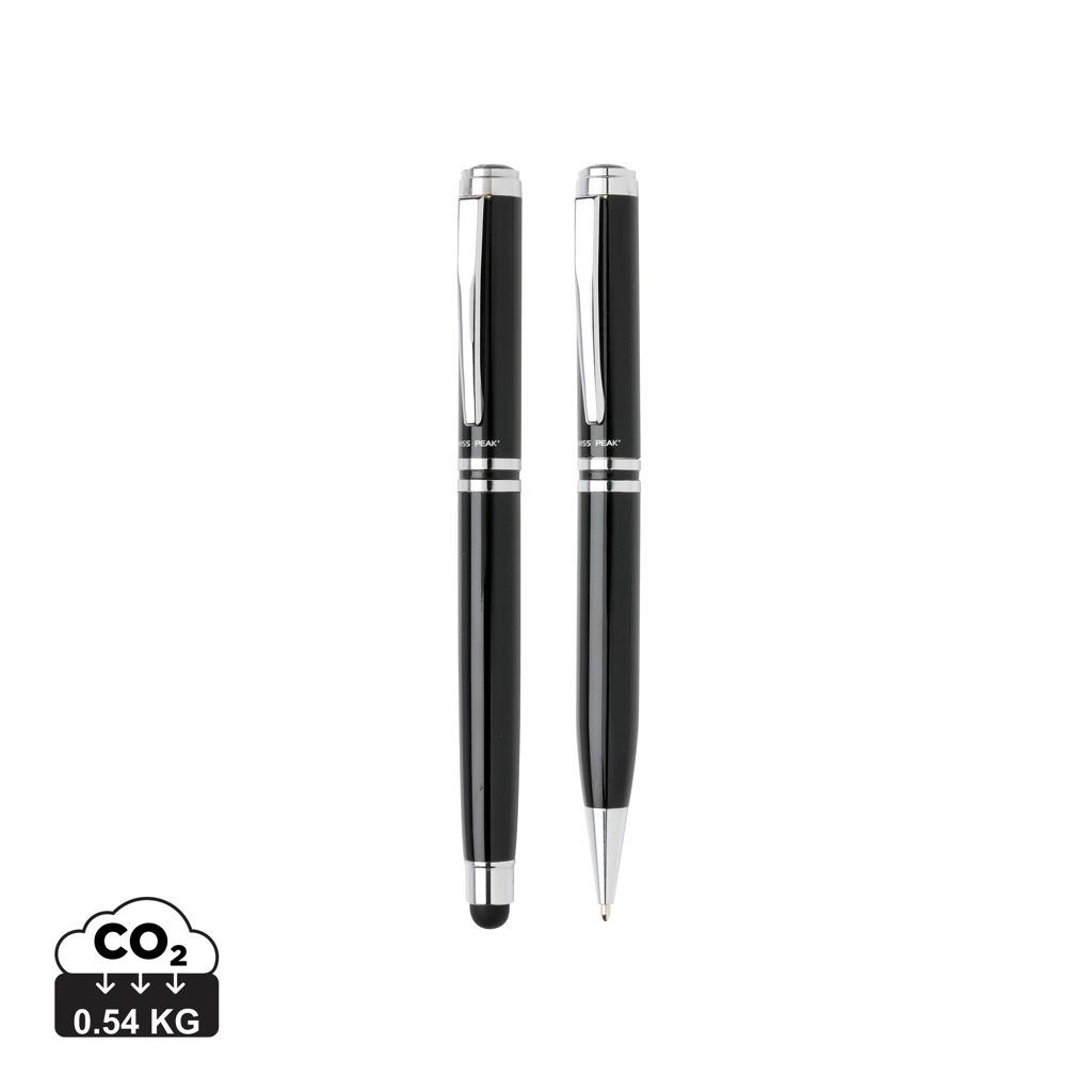 Hochwertiges Schreibset aus Kupfer bestehend aus einem Rollerball mit Stylus und einem Kugelschreiber je mit Swiss Peak Logo. Verpackt im PU Etui und einer Geschenkbox. Blau schreibend.