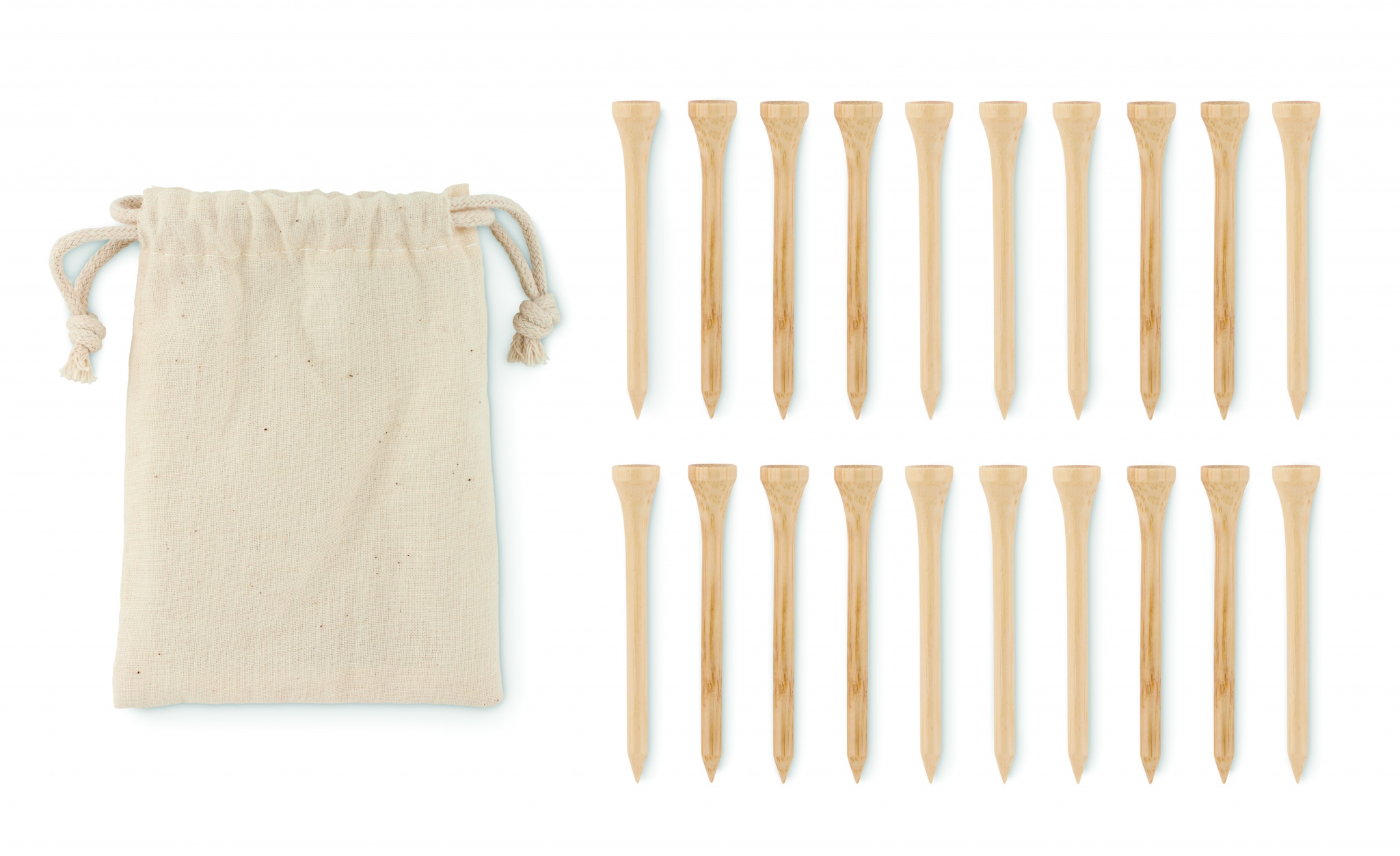 Golf-Tees aus Bambus. 20 Stück. Lieferung in einem Kordelzugbeutel aus Organic Cotton. Bambus ist ein natürliches Produkt, es kann daher zu leichten Abweichungen in Farbe, Dekor und Maßen kommen.