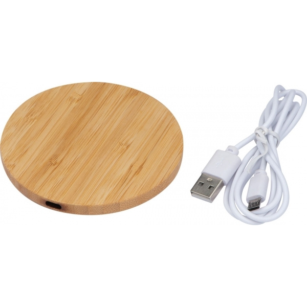 Runder Wireless Charger aus Bambus mit Ladekabel, passend für alle QI-fähigen Smartphones. Ihr Logo platzieren wir auf dem Charger.