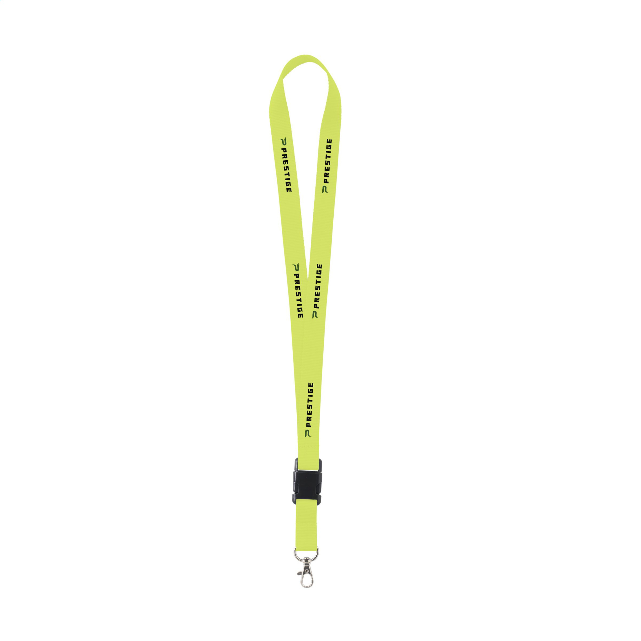 Schlüsselband aus robustem gewebtem Polyester mit Karabinerhaken aus Metall. Der untere Teil ist mit dem Schnellverschluss-Kunststoffclip abnehmbar.