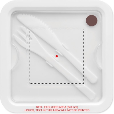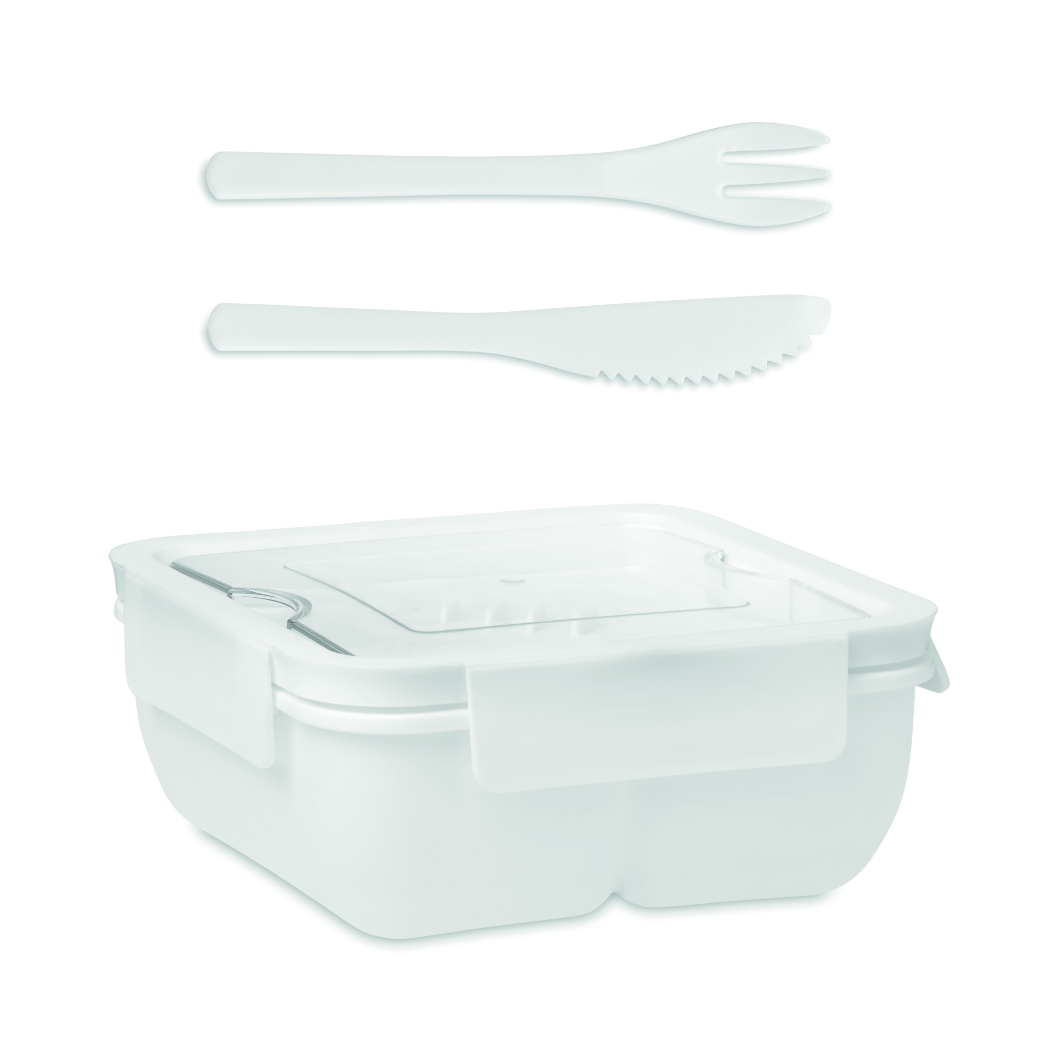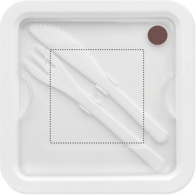 Lunchbox aus PP mit 2 Fächern. Inklusive Messer und Gabel aus PP im Deckel. Füllmenge: 600 ml.