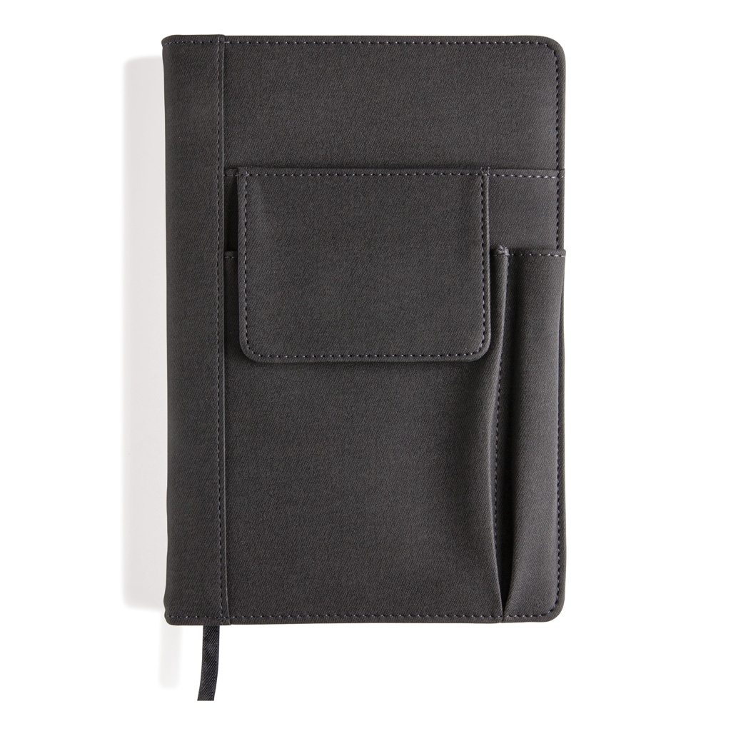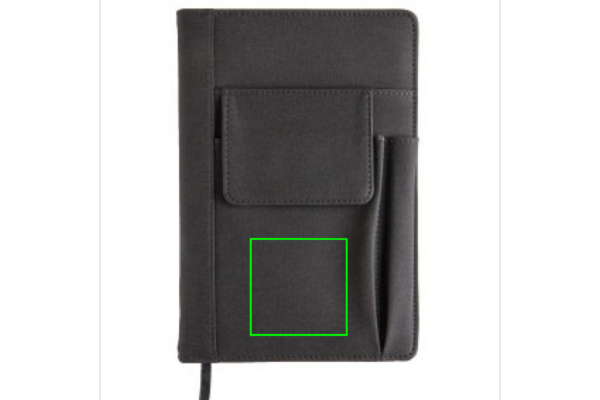 Beschichtetes PU Notizbuch mit Telefontasche (14 x 10 cm), Stifthalter und Hauptfach für z.B. eine Powerbank oder Visitenkarten. Schwarzer Seitenteiler und 160 linierten Seiten aus 80g/m2. Mit neuem A5 Notizbuch kann das Cover stets wiederverwendet werden.