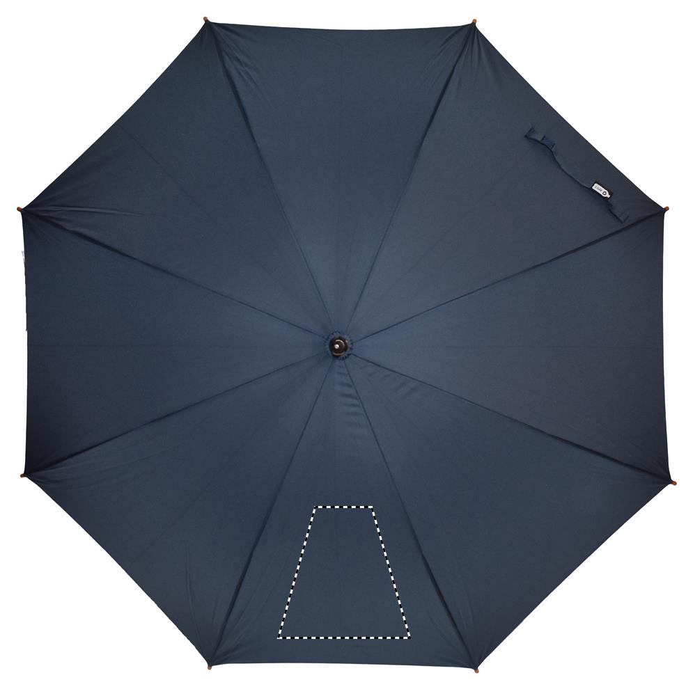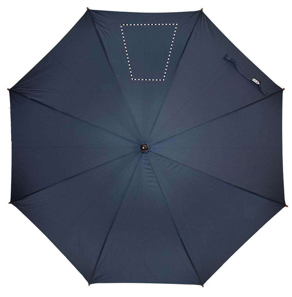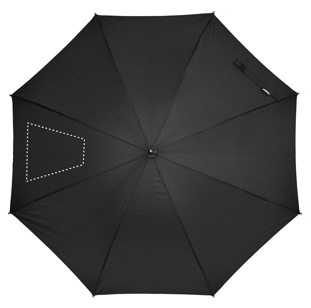 23'' Regenschirm aus 190T RPET Pongee. Stock, Spitzen und Krone aus Holz, Stangen aus schwarz überzogenem Metall. Gebogener, naturbelassener Griff aus Holz. Automatische Öffnung, manuelle Schließung.