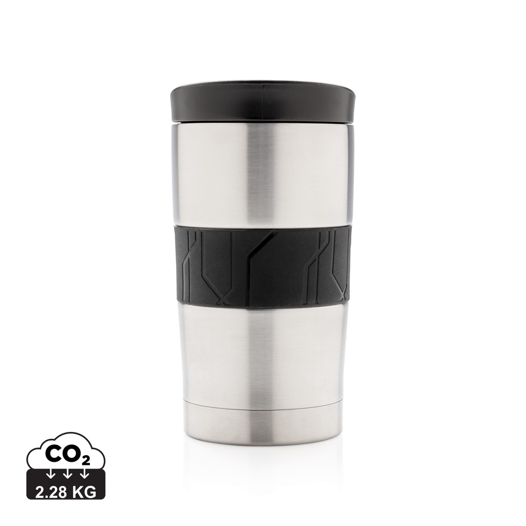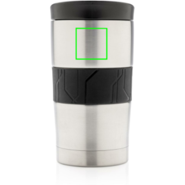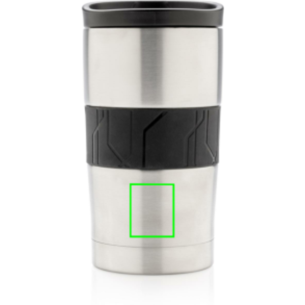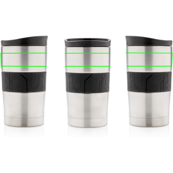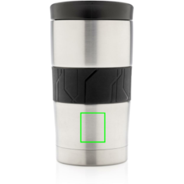 Vakuumisolierte Tasse aus doppelwandingem 304 SS mit Silikongriff und Schubverschluss. Spülmaschinenfest. Ein Druck auf dem Becher wird einer Spülmaschinenwäsche jedoch nicht dauerhaft standhalten, daher empfehlen wie hier die Lasergravur. Inhalt: 300ml