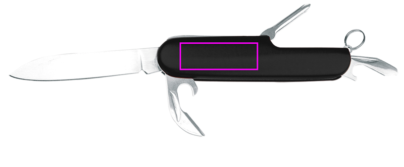 Handliches Edelstahl-Taschenmesser mit sieben Teilen, darunter eine große Klinge, Dosen- und Flaschenöffner, Korkenzieher, Kreuz- und Schlitzschraubendreher und ein Schlüsselring. Ihre Werbung gravieren wir auf die Aluminiumschale.