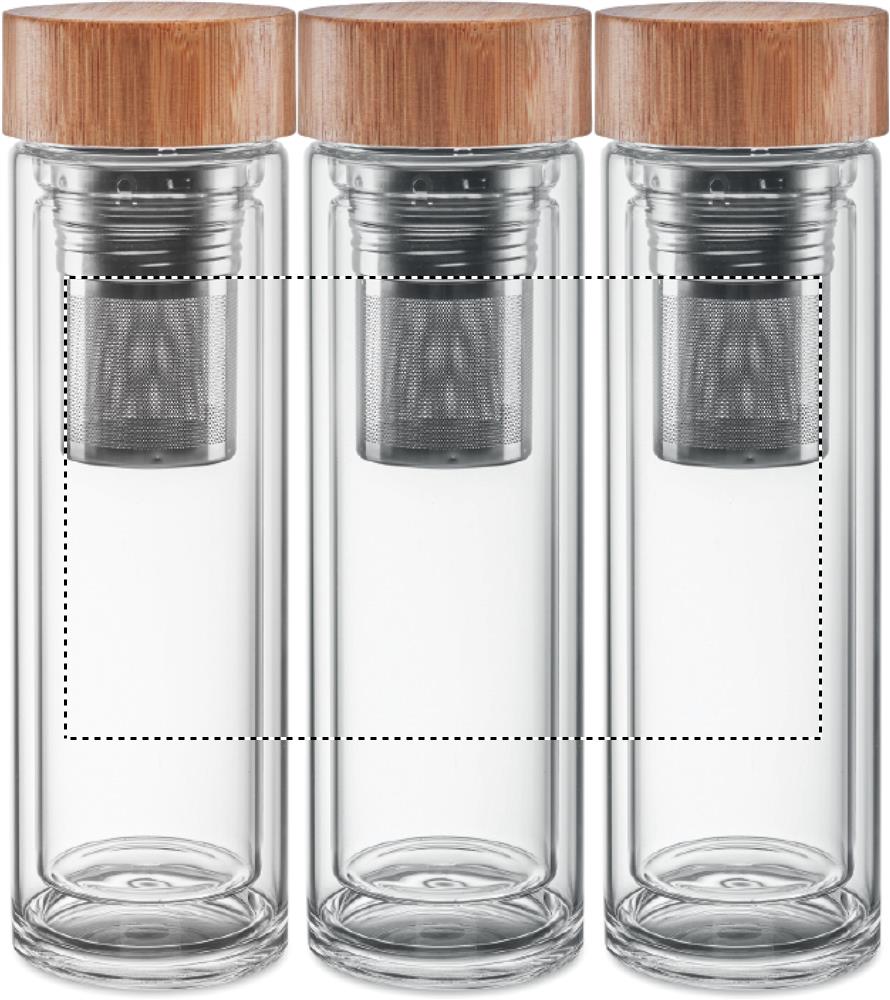 Doppelwandige Trinkflasche aus Borsilikat-Glas. Deckel aus Bambus. Mit Tee-Sieb. Füllmenge: 400 ml. Bambus ist ein natürliches Produkt, es kann daher zu leichten Abweichungen in Farbe, Dekor und Maßen kommen. Auslaufsicher. Eine Lasergravur ist auf Borosilikatglas nicht möglich.