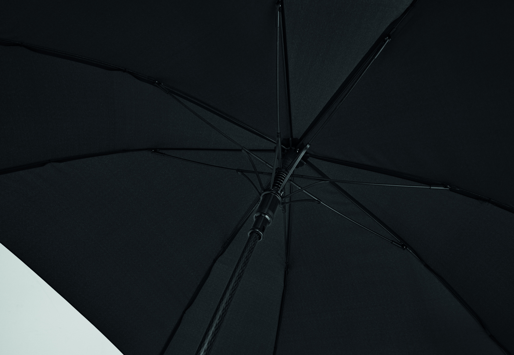 23-inch windproof auto-open square umbrella in 190T pongee polyester. Features full fibreglass frame and ribs, rubber-finished ABS handle.