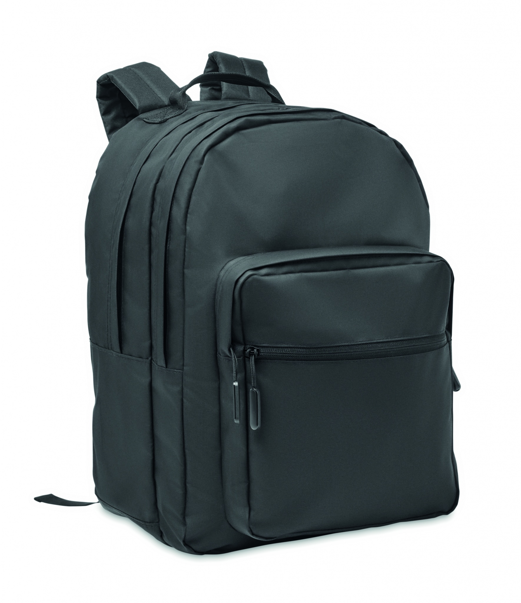 15 inch laptop backpack in 300D RPET polyester. It has 2 large zippered compartments, double zippered front pockets and mesh side pocket. Padded back, bottom and shoulder straps.