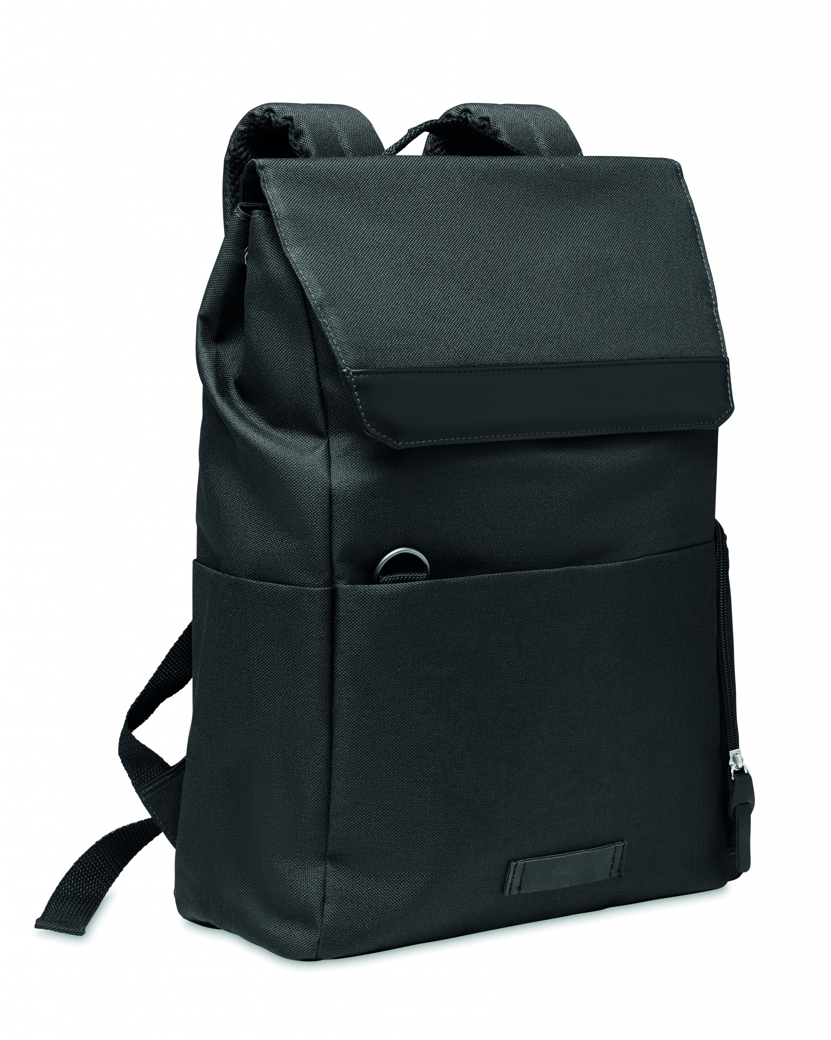 600D 2 tone RPET 15 inch laptop backpack with magnetic snap button. Padded laptop compartment, front zippered pockets and 2 side pockets.