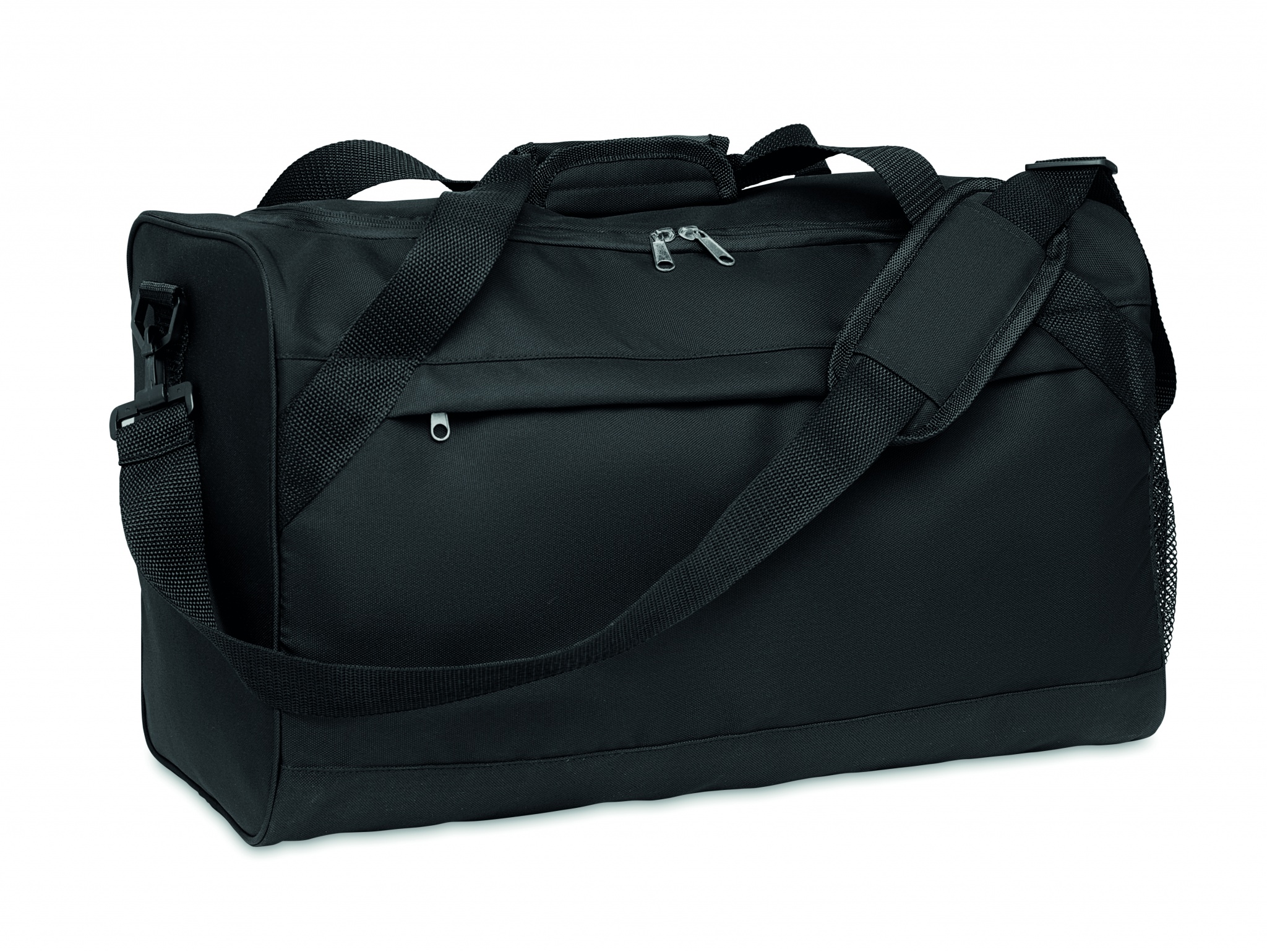 Sport or travelling bag in 600D RPET with large zippered front pocket, inside zippered pocket and adjustable and detachable shoulder strap.