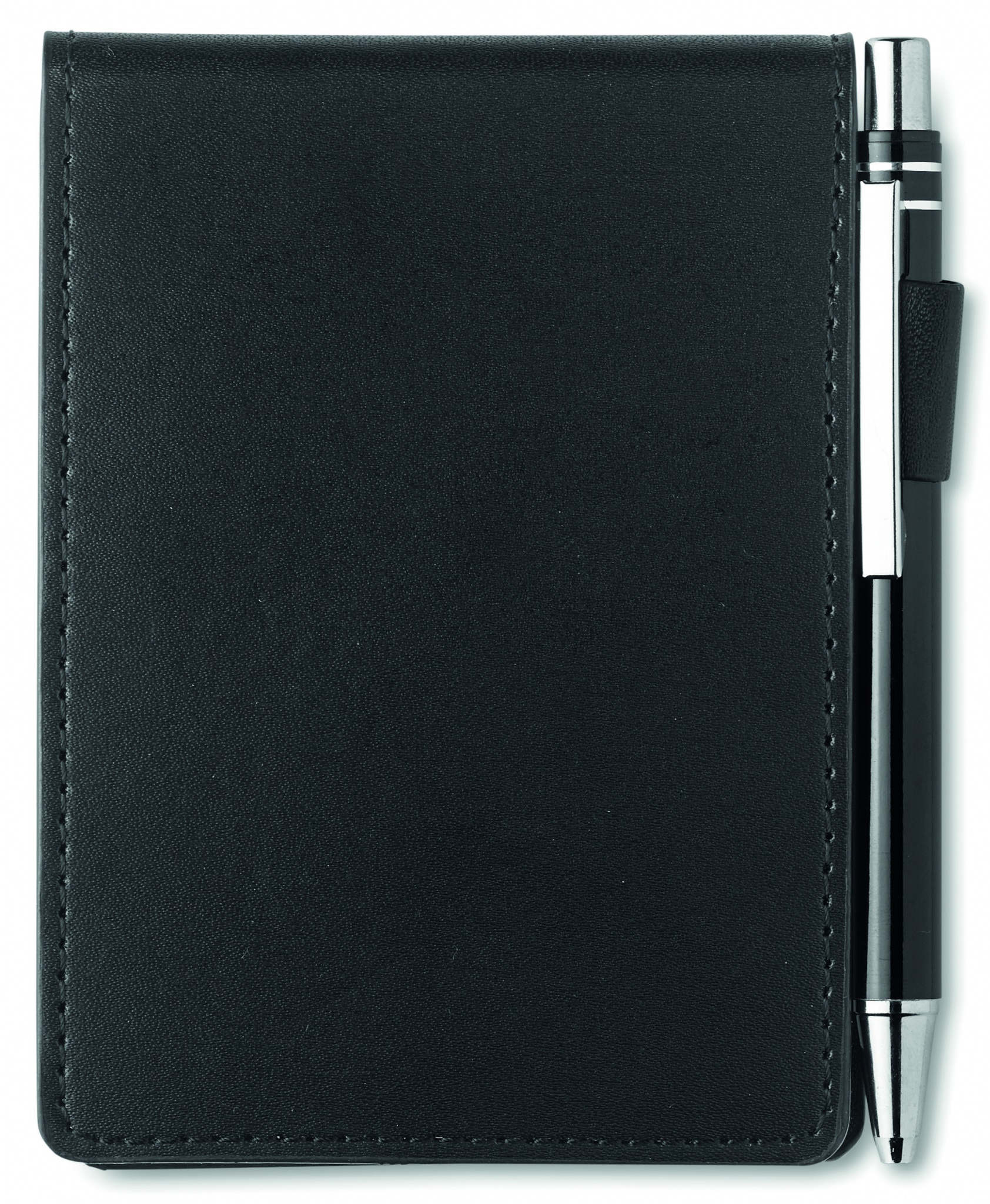 A7 notepad with matching pen. PU pouch with pen holder. 60 plain pre-perforated sheets. Matching metal push button ball pen. Blue ink.