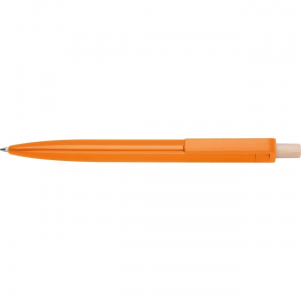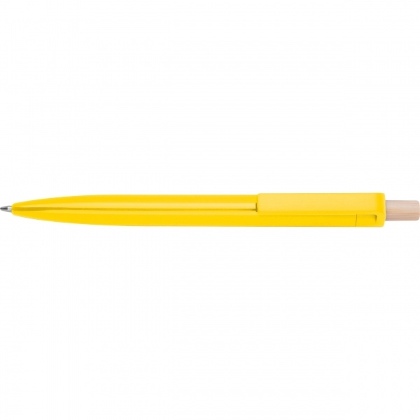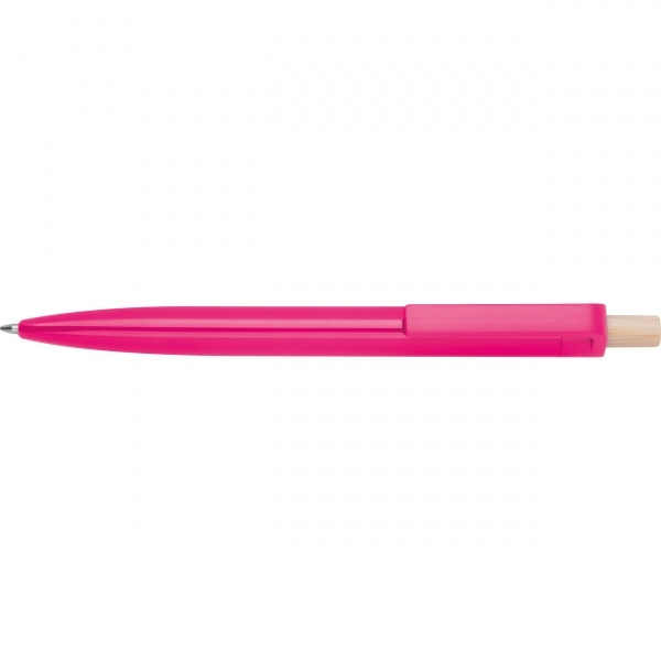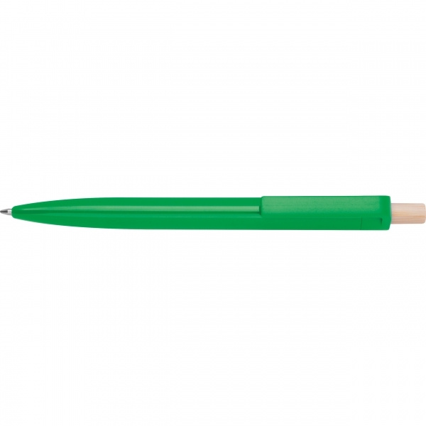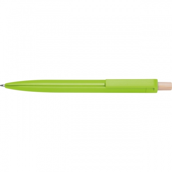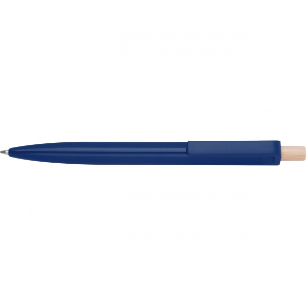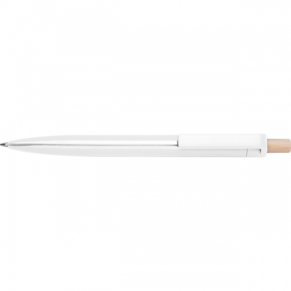 Ballpoint pen made from recycled ABS with a bamboo push button. It features a blue-writing plastic refill. Your logo is printed on the barrel below the clip.