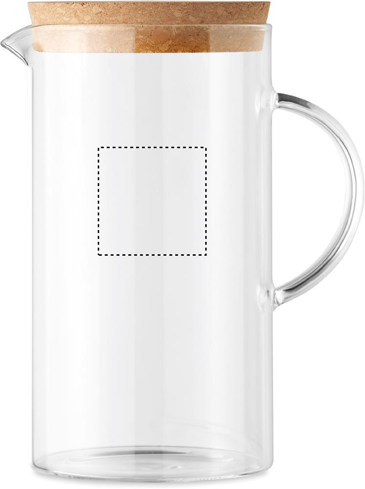 Borosilicate glass water/juice decanter with cork lid. Capacity: 1L. Cork is 100% natural material. Due to its structural nature and surface porosity the final print result per item may have deviations.