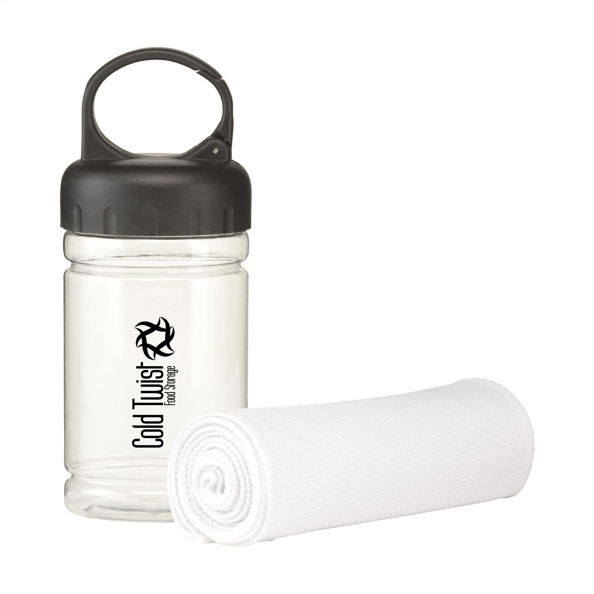 Special cooling towel made from 100% polyester. After immersing in cold water, this towel is an effective cooling instrument and a deterrent to sunburn. Size 30 x 80 cm. Ideal to wear as a neck cooler. Comes in a transparant case with ABS screw cap with carabiner hook.