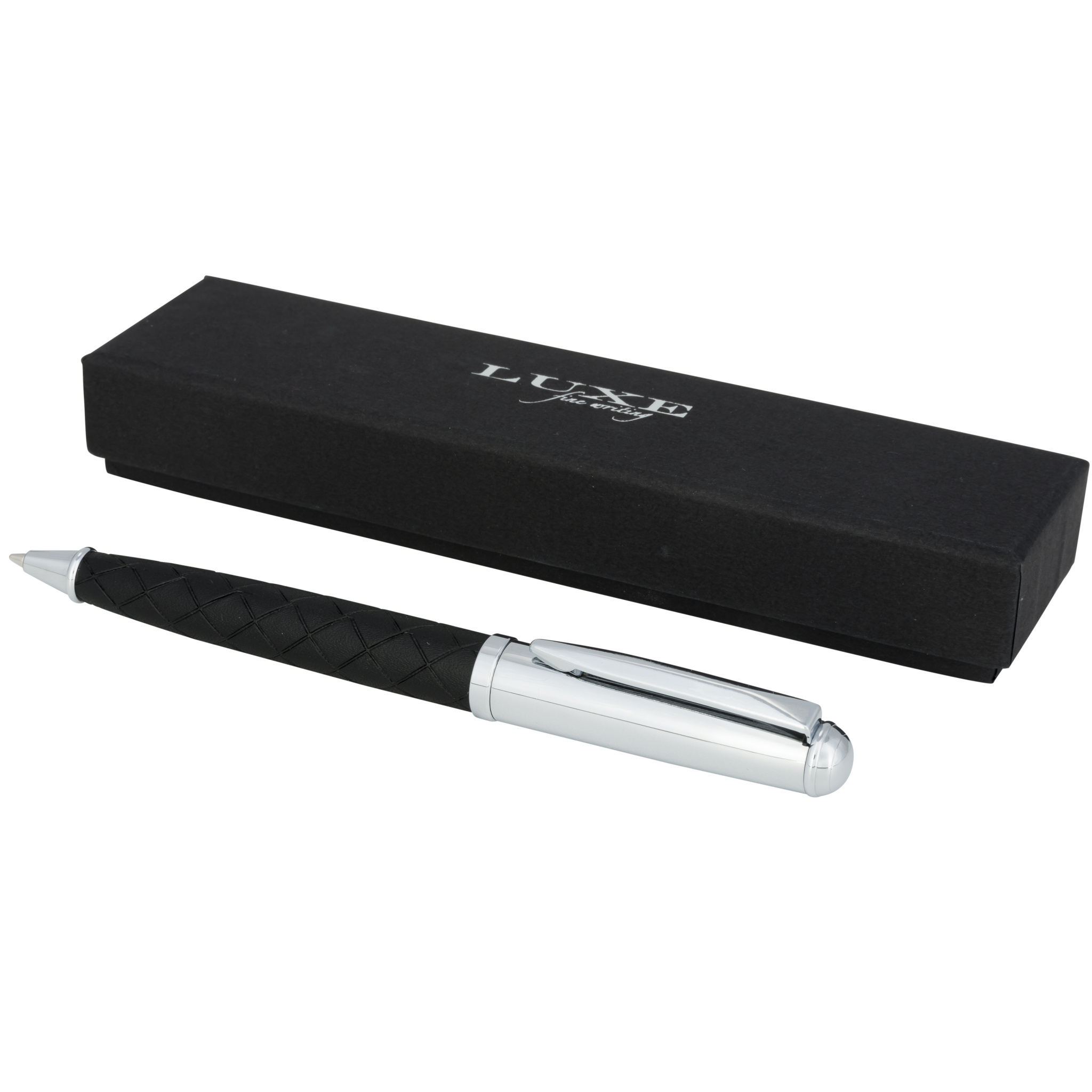 Exclusively designed ballpoint pen with leather wrapped lower barrel featuring a cross line pattern. Includes a premium black refill and packed in a ''LUXE'' gift box (16x4.5x2.5cm).