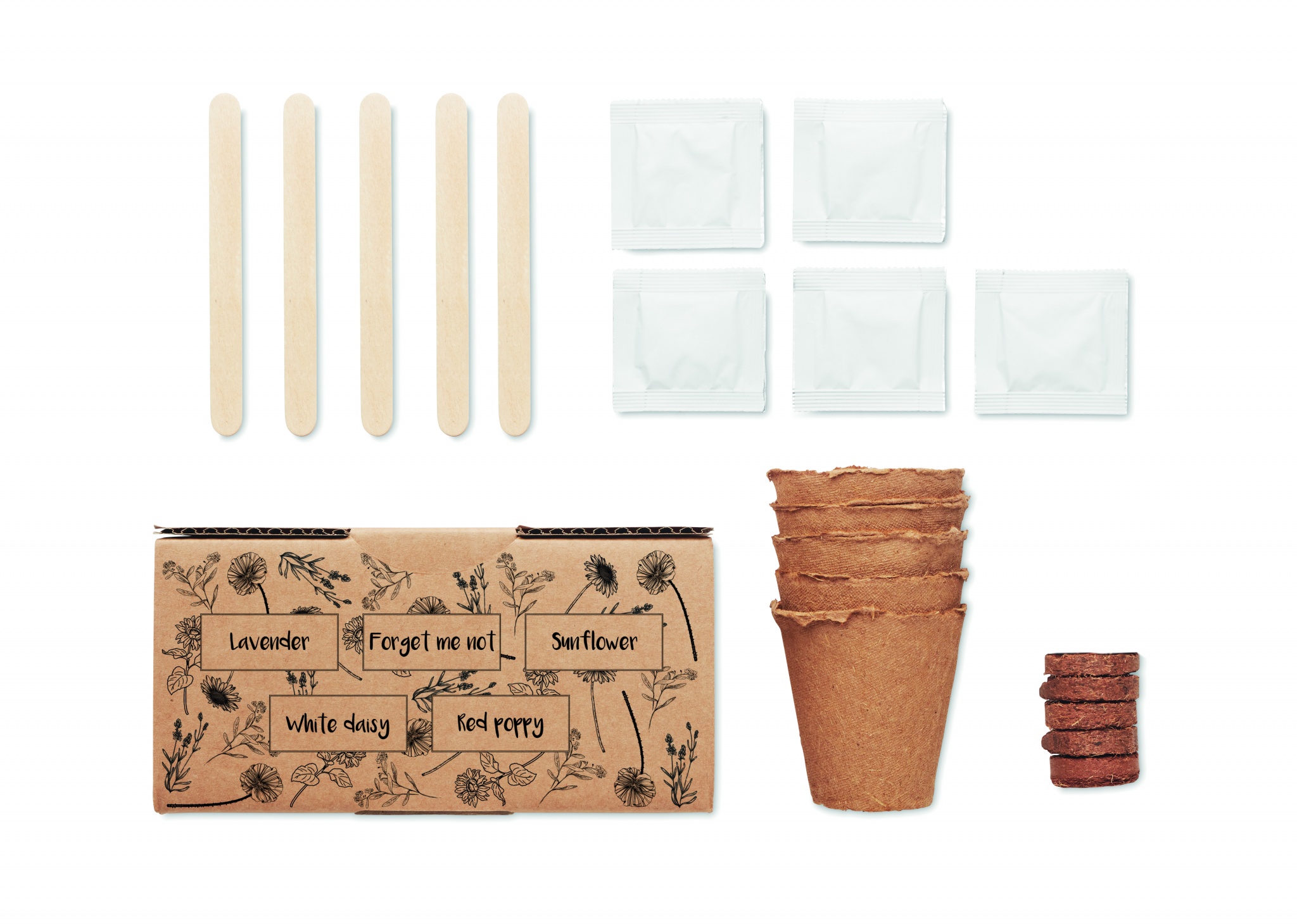 Flowers growing kit. Box with lavender, forget me not, sunflower, white daisy and red poppy seeds. Made in EU. Soil tablet included.