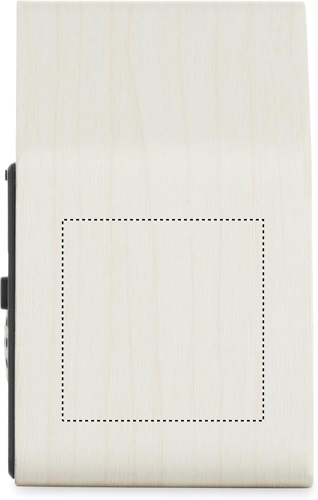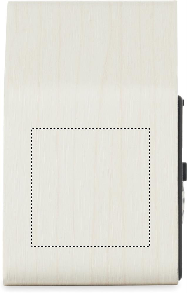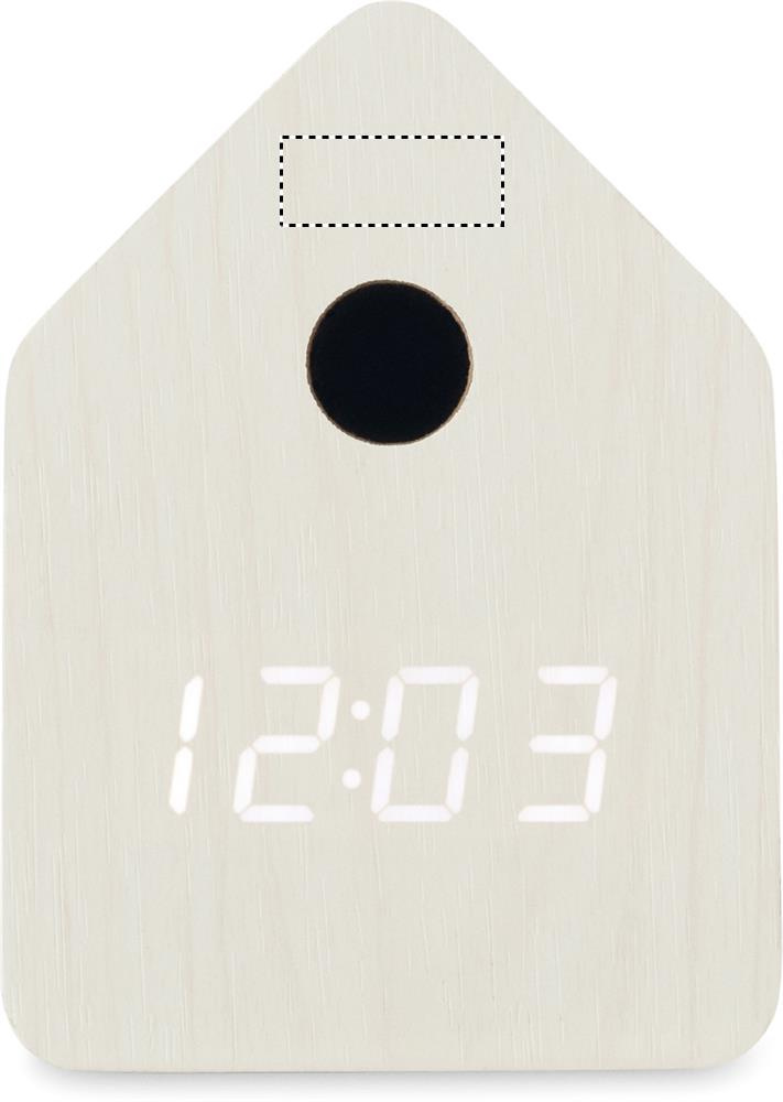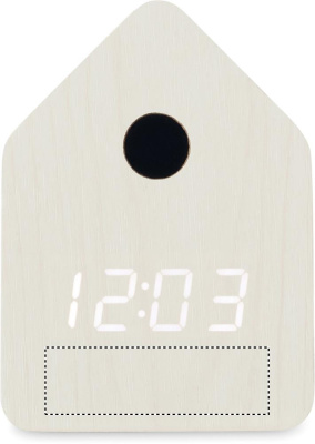 Small MDF desk clock including a built-in alarm with bird cuckoo voice and temperature display. Bird cuckoo voice every full hour and during alarm. White LED display. Sound is automatically silenced between 22.00h to 06.00h. 5 mins snooze intervals