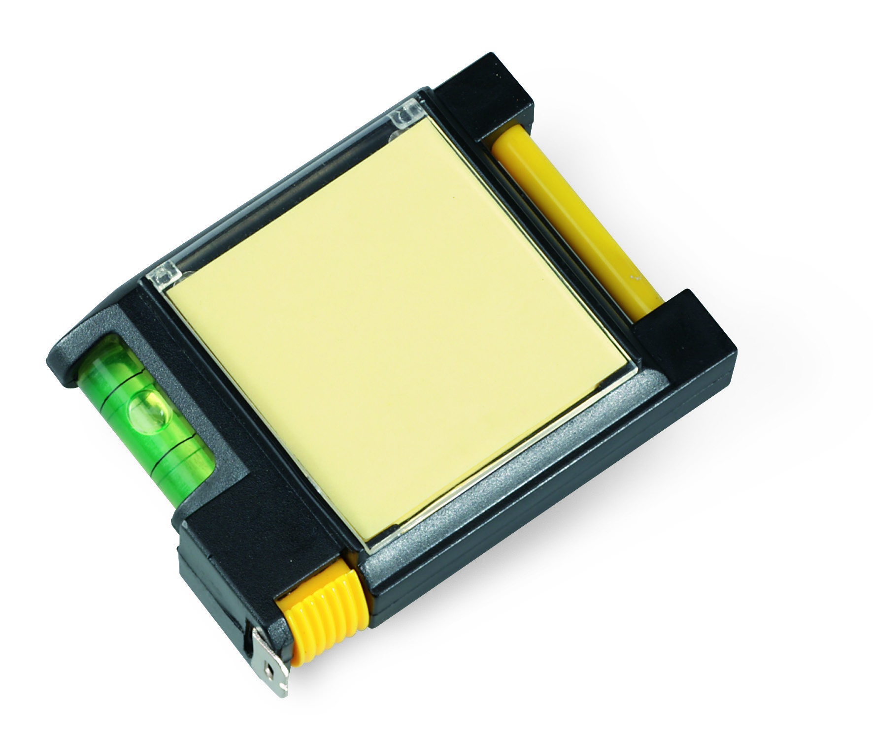 2 m measuring tape. Includes a memo pad, ball pen and spirit level.