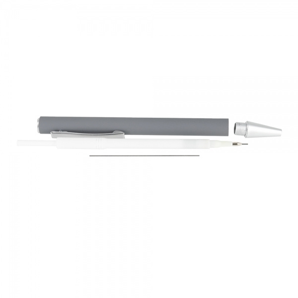 Mechanical pencil made of metal with a rubber finish surface and two pencil leads (0,5 mm).