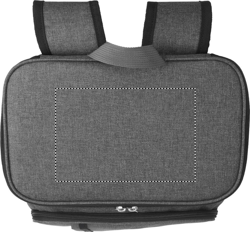 Cooler bag or outdoor picnic backpack in 2 tone 600D RPET including 2 person table accessories. It has stainless steel knife, and PP fork, spoon and cup.