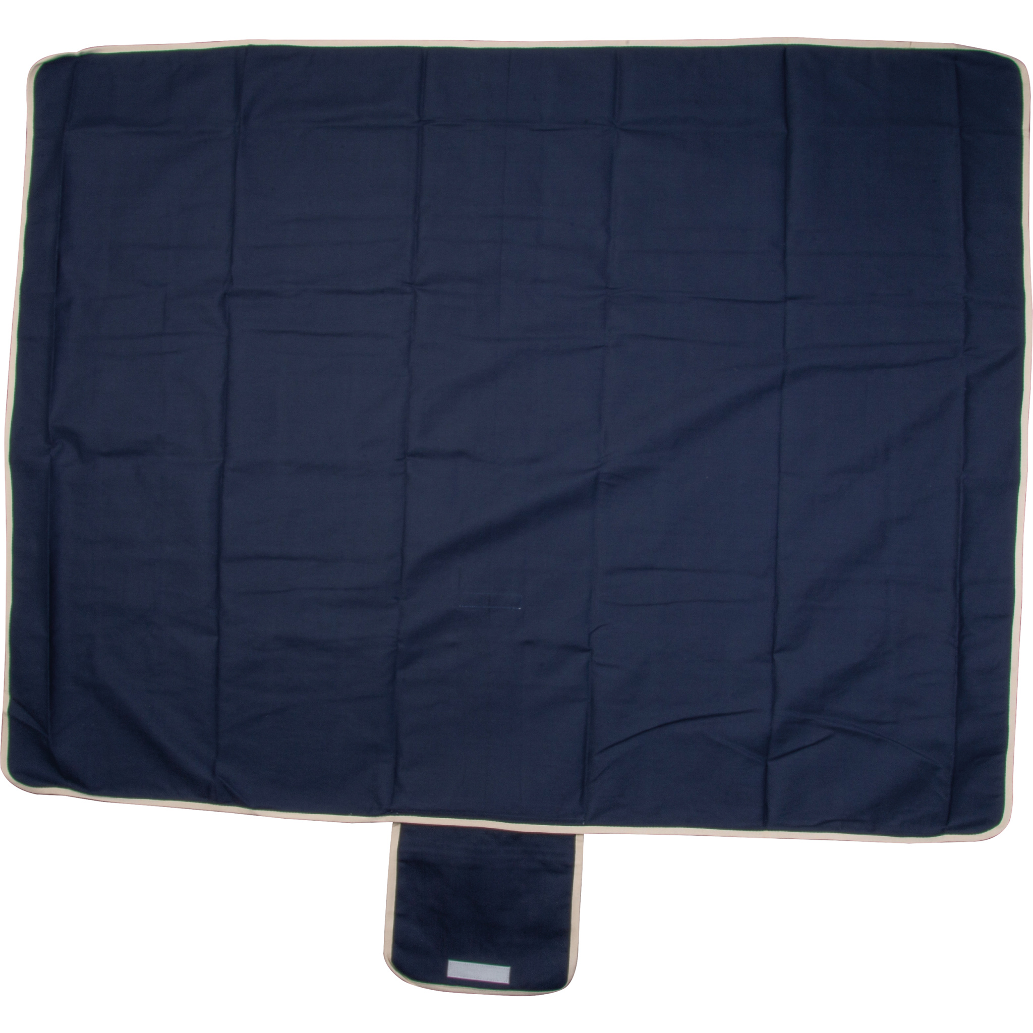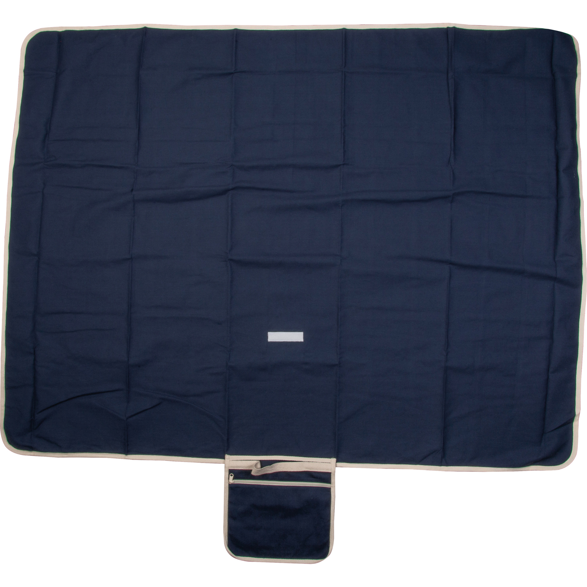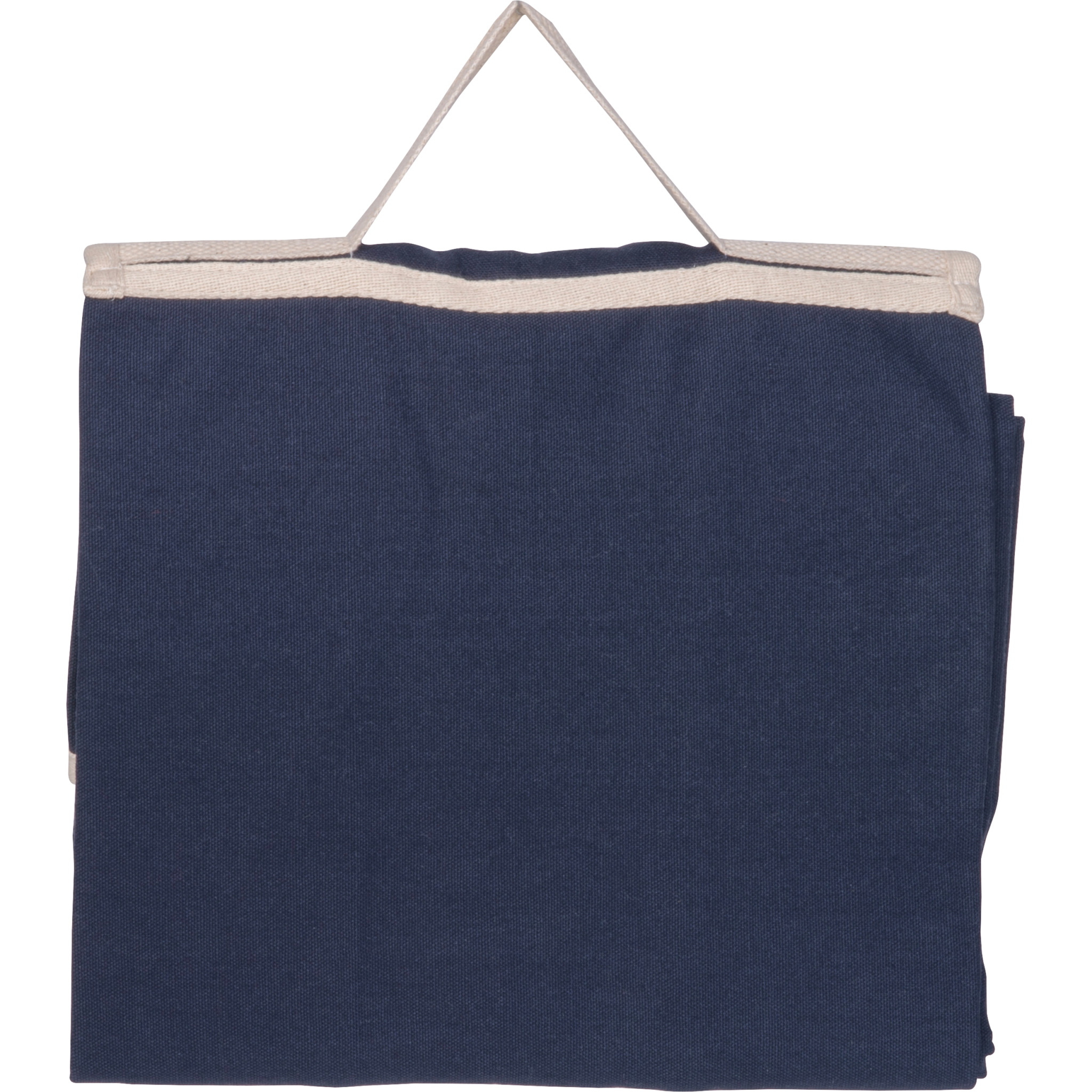 Picnic blanket made of recycled cotton (fabric weight: 320 gsm), featuring a carrying handle, zippered pocket, and a flap with hook-and-loop closure. Dimensions when open: 160 x 128 cm.