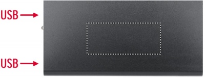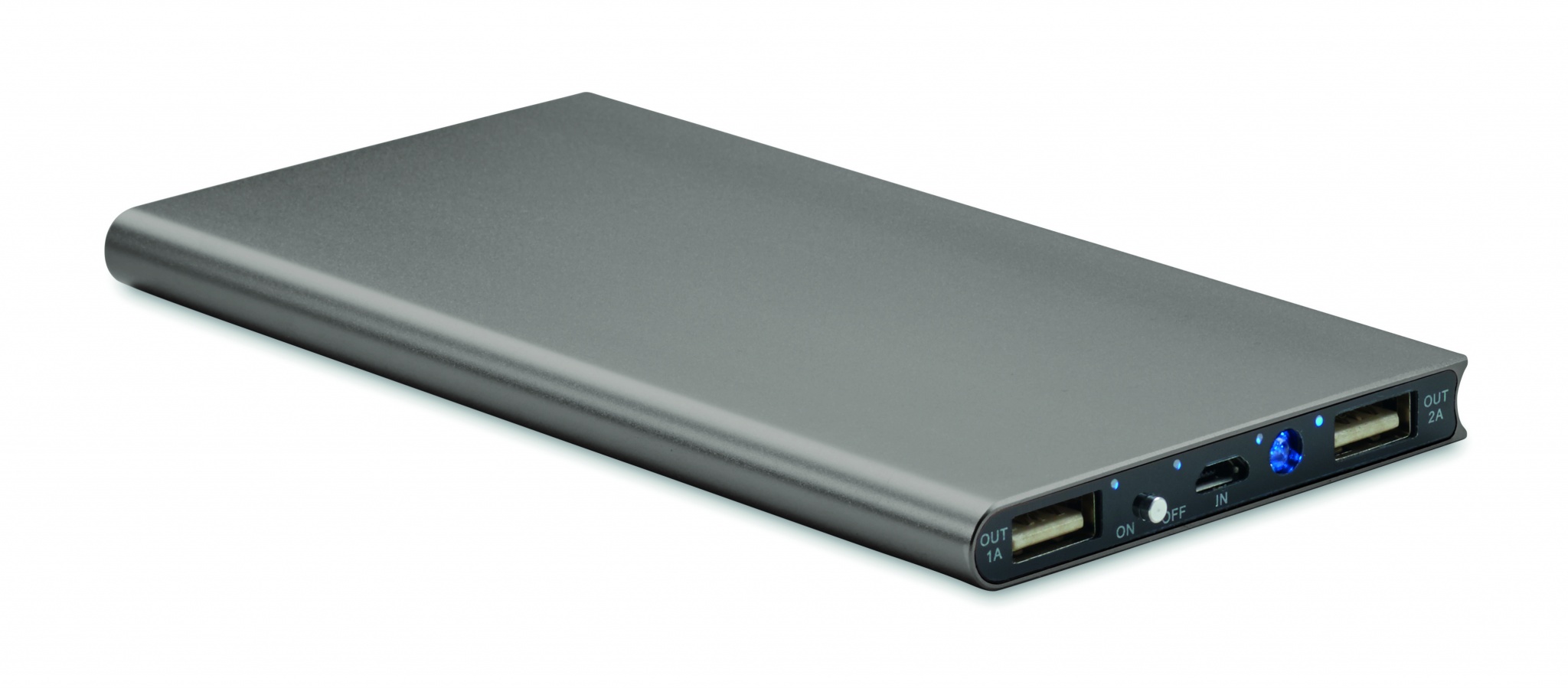 Power bank 8000 mAh in aluminium. Capacity for smartphone use, output current DC5V/1A and DC5V/2A . Includes indicating light and USB cable with micro usb plug.