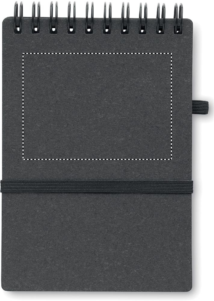 Recycled paper and PU cover (70% recycled paper and 30% PU) notebook. Twin-wire. 140 lined recycled paper pages (70 sheets). Matching push button ball pen in recycled carton and ABS parts. Blue ink. Elastic closure strap and pen holder.