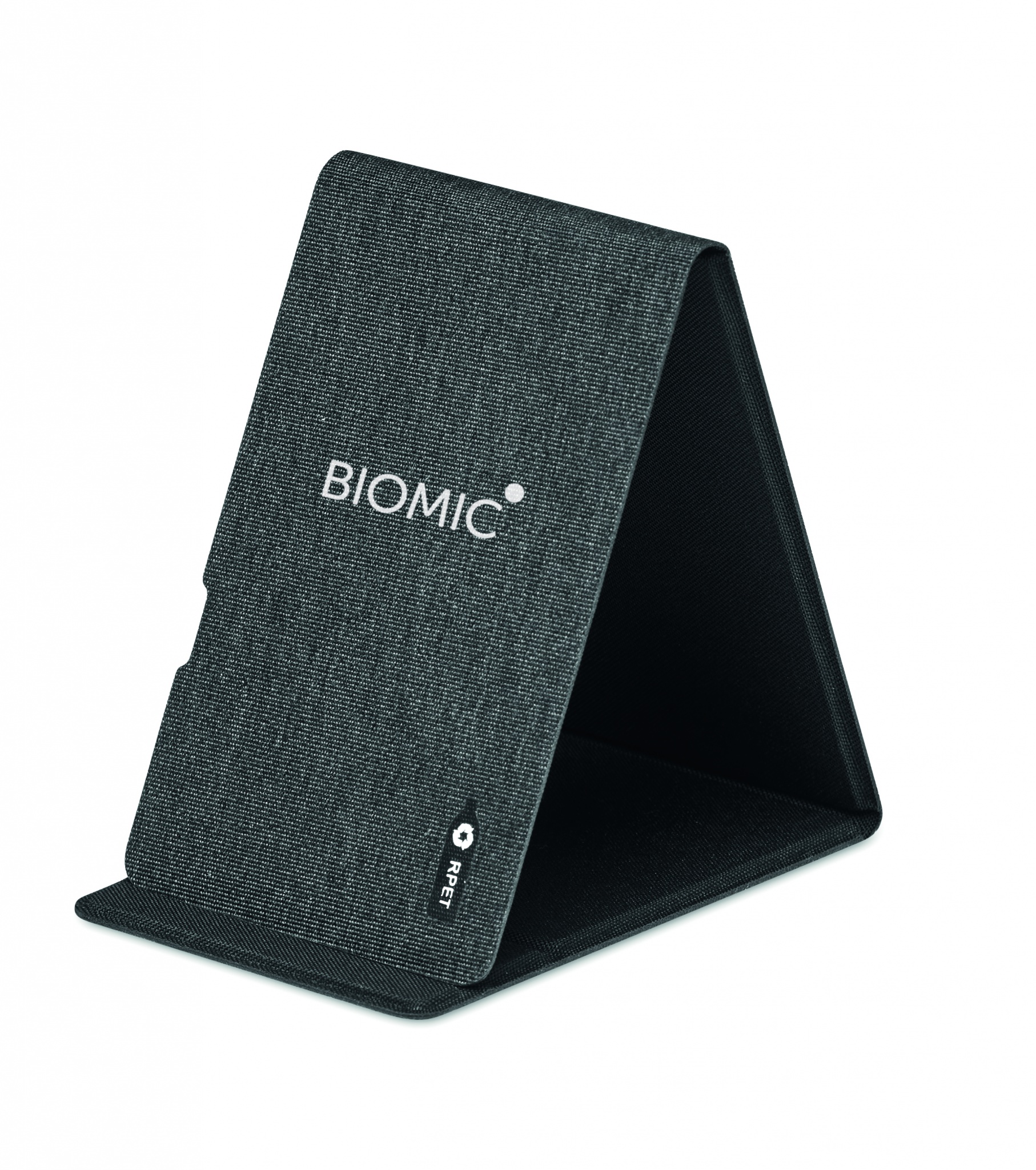 300D 2 tone RPET and 15W wireless charging phone stand. Output: 9V/1.6A (15W) for quick charging. Compatible with latest Androids, iPhone® 8and newer.