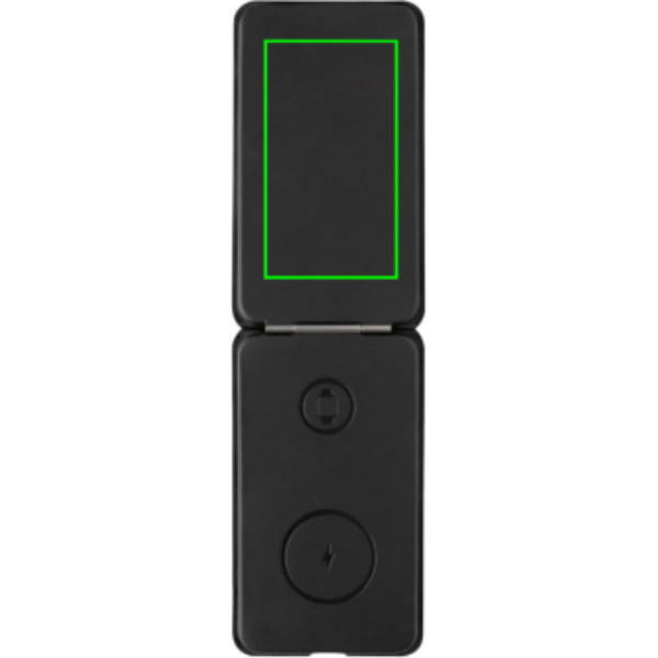 Luxury and foldable 3-in-1 wireless charger made with RCS certified recycled PU. Total recycled content: 5% based on total item weight. RCS certification ensures a completely certified supply chain of the recycled materials. The wireless charger comes equipped with a magnetic 15W wireless charger on the front. On the reverse is an additional 5W wireless charger suitable for earbuds cases or other small wireless chargeable devices and 2.5W wireless charger for smartwatches ( Apple watches only) Including RCS certified 120 cm recycled TPE cable. Packed in FSC® mix kraft packaging. Item and accessories 100% PVC free. Input: 9V/3A for optimal use. Output: Front: 9V/1.1A; 9V/1.67 A/(15W), Earbuds: 5V/1A (5W), Watch: 5V/0.5A.