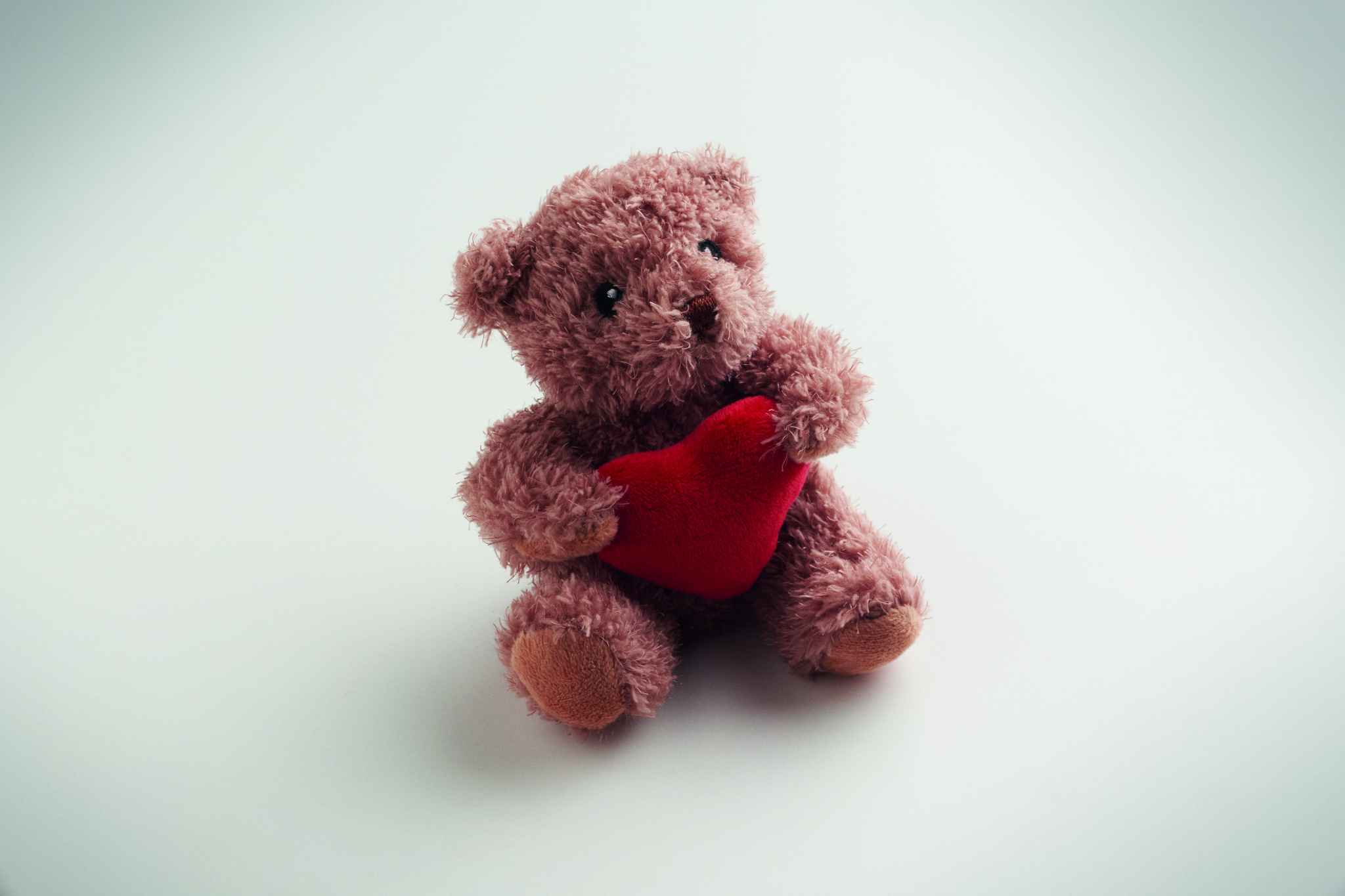 Polyester teddy bear plush holding a red heart, Embroidered eyes, nose and mouth.