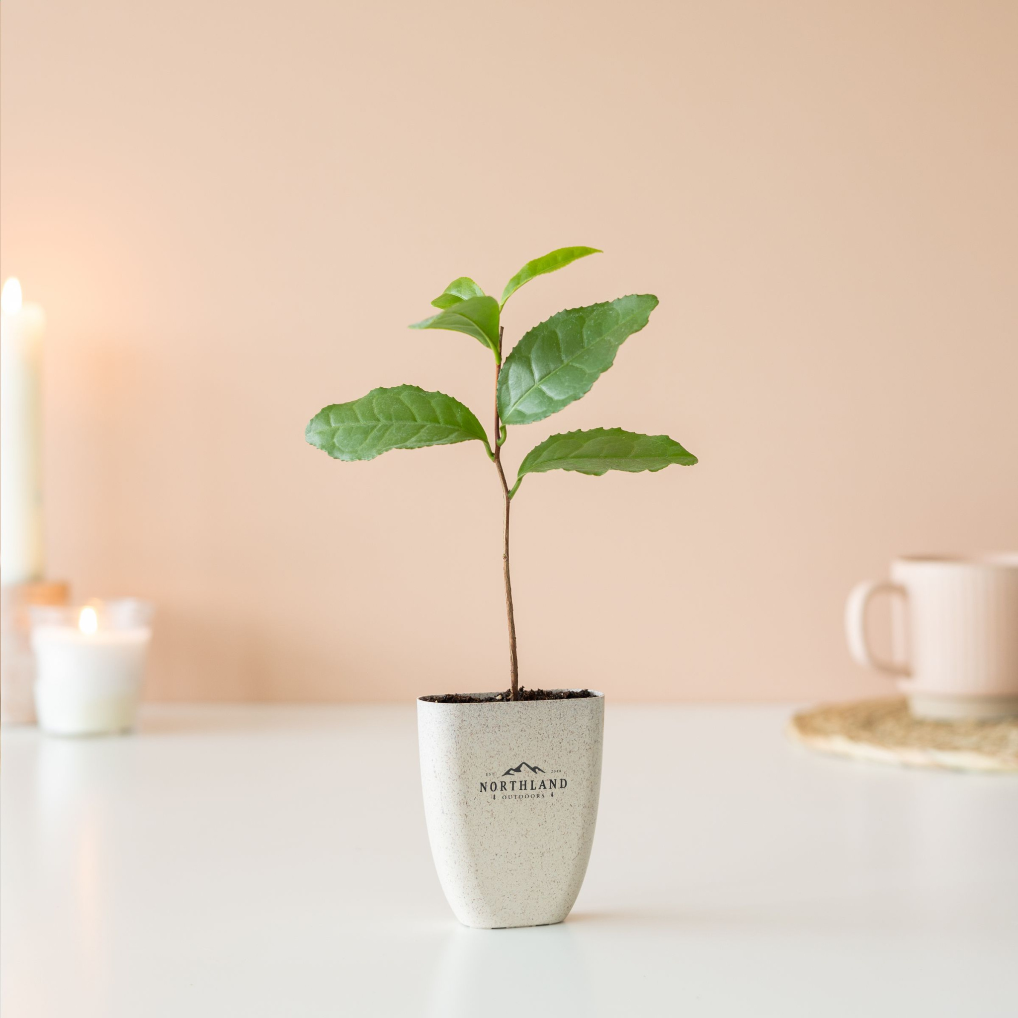 Mailbox tree from the Treemore brand: Tea plant (Camellia sinensis). A product in which the tree takes centre stage, where everyone can take care of their own tree at home, watching it grow. The trees are sourced from an Dutch nurseries and are delivered in a flower pot and packaging that has been specially developed to fit through a letterbox. The tree is supplied in the soil and in a bio-based flower pot made from elephant grass fibres. The packaging and the supplied information booklet are FSC® certified and 100% recyclable. An original way to surprise someone whilst also making the world a little greener.