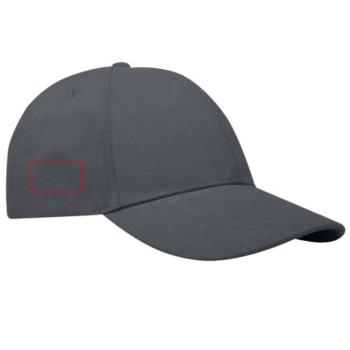Sustainable promotional headwear. Pre-curved visor. Embroidered eyelets for ventilation. Tri-glide metal buckle closure. Head circumference: 58 cm.