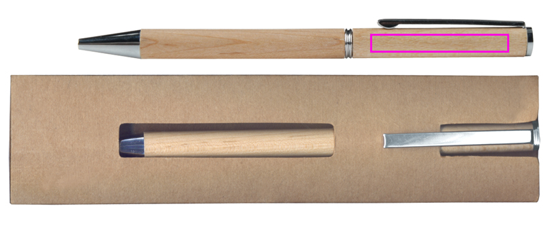 Classic wood pen with a blue-writing plastic refill and a cardboard case. We engrave your logo below the clip.