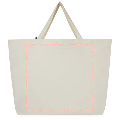 See suure mahutavusega kandekott on valmistatud parimatest, 100% taaskasutatud materjalidest. See on ehitatud igapäevaelus kasutamiseks ja sobib raskete raamatute või toidukaupade kaasaskandmiseks. 200 g/m² taaskasutatud puuvilla/polüestri segu tagab vastupidavuse ja töökindluse, andes kotile vastupidavuse kuni 14 kg kaalule. Lõngad pärinevad Aasiast, kuid kudumine, ketramine ja tootmine toimub Prantsusmaal.