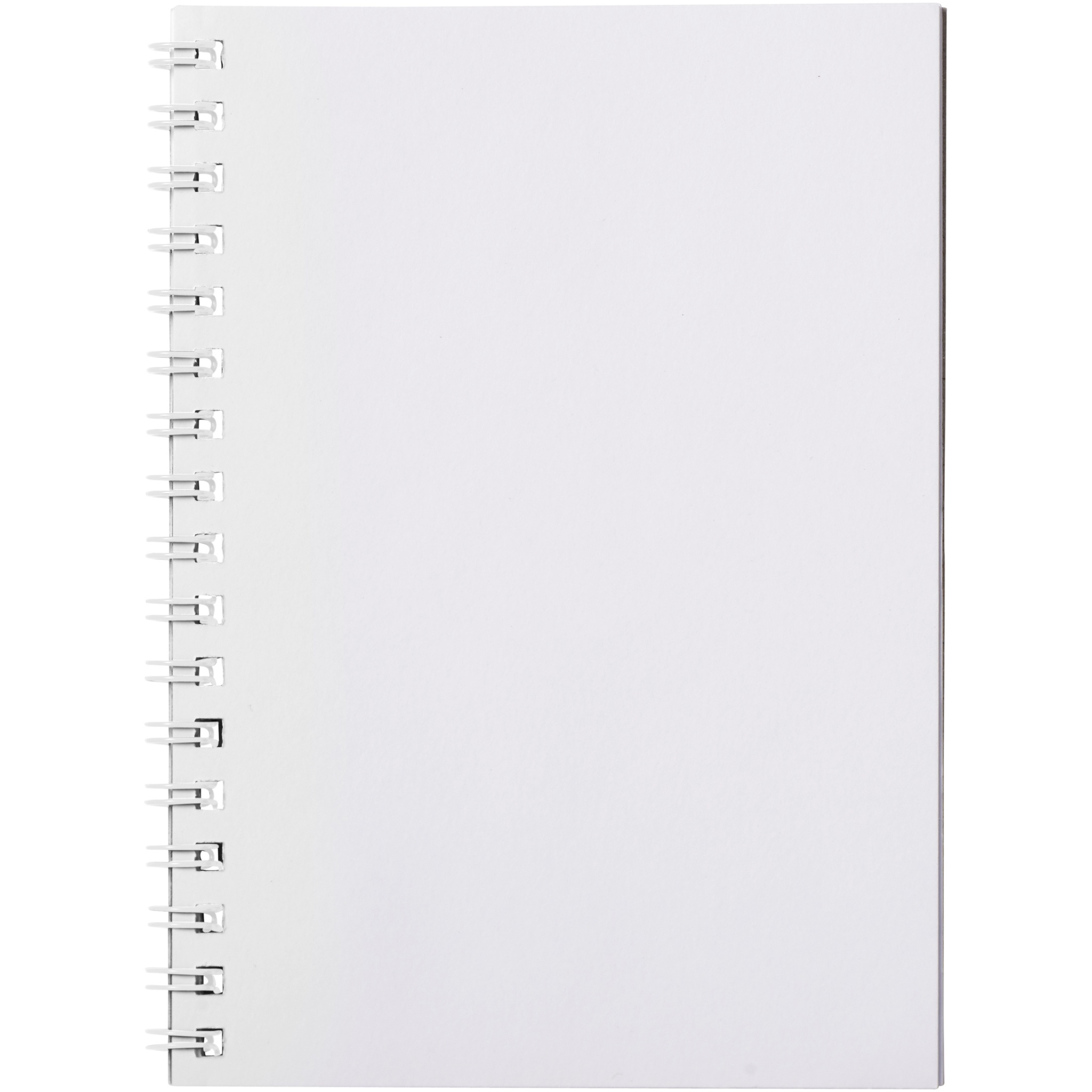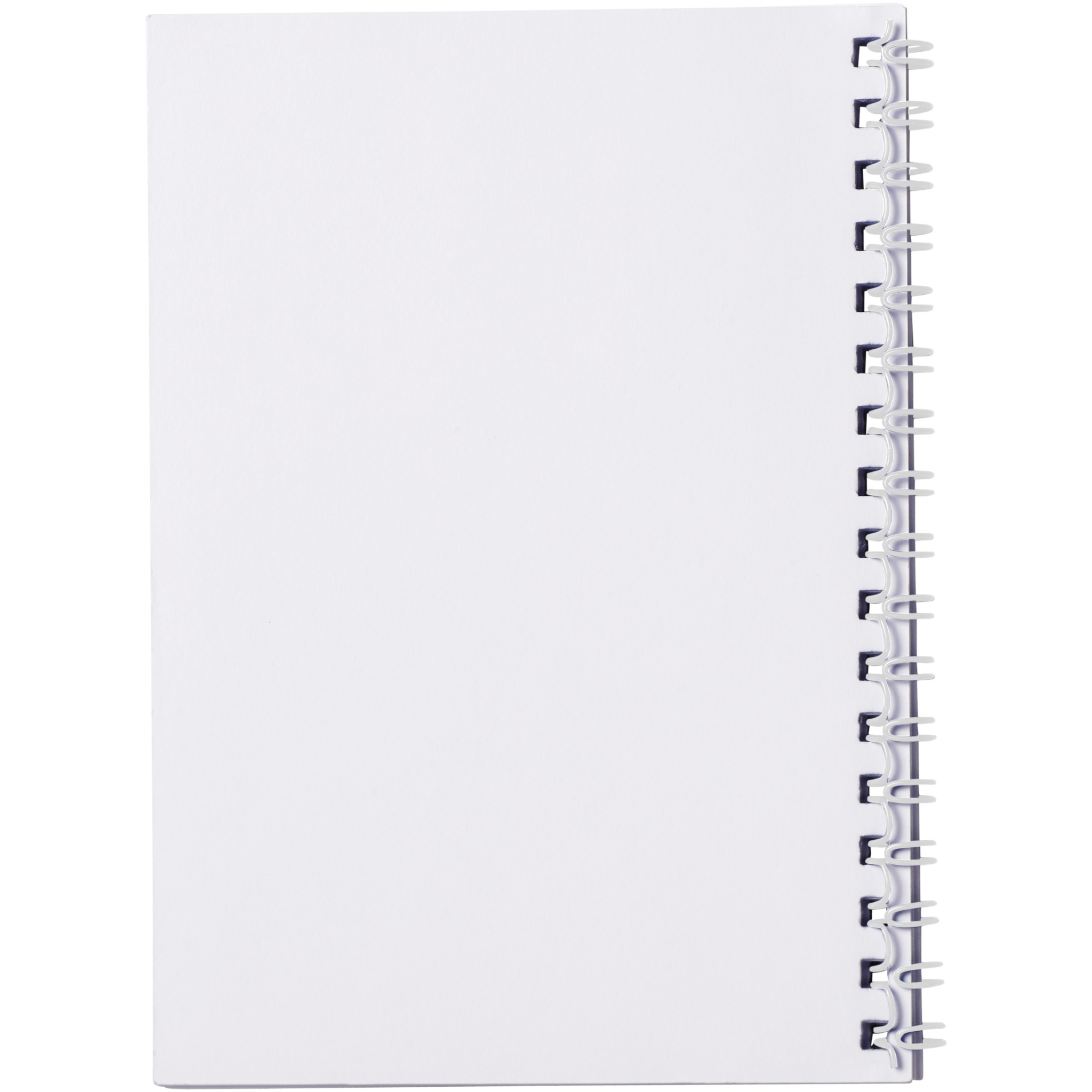 Desk-Mate® spiraalne A6 märkmik. Sisaldab 50 tühja 80 g/m2 paberilehte, läikivat kaardi esikaant (250 g/m2) ja 450 mikronit läbipaistvat polüpropüleenist katet. Must või valge traat. Saate kohandada selle mitmekülgse märkmiku lehti mis tahes kujundusega – nii et olenemata sellest, kas soovite joonelist paberit, ruute või punkte – kõik on võimalik!