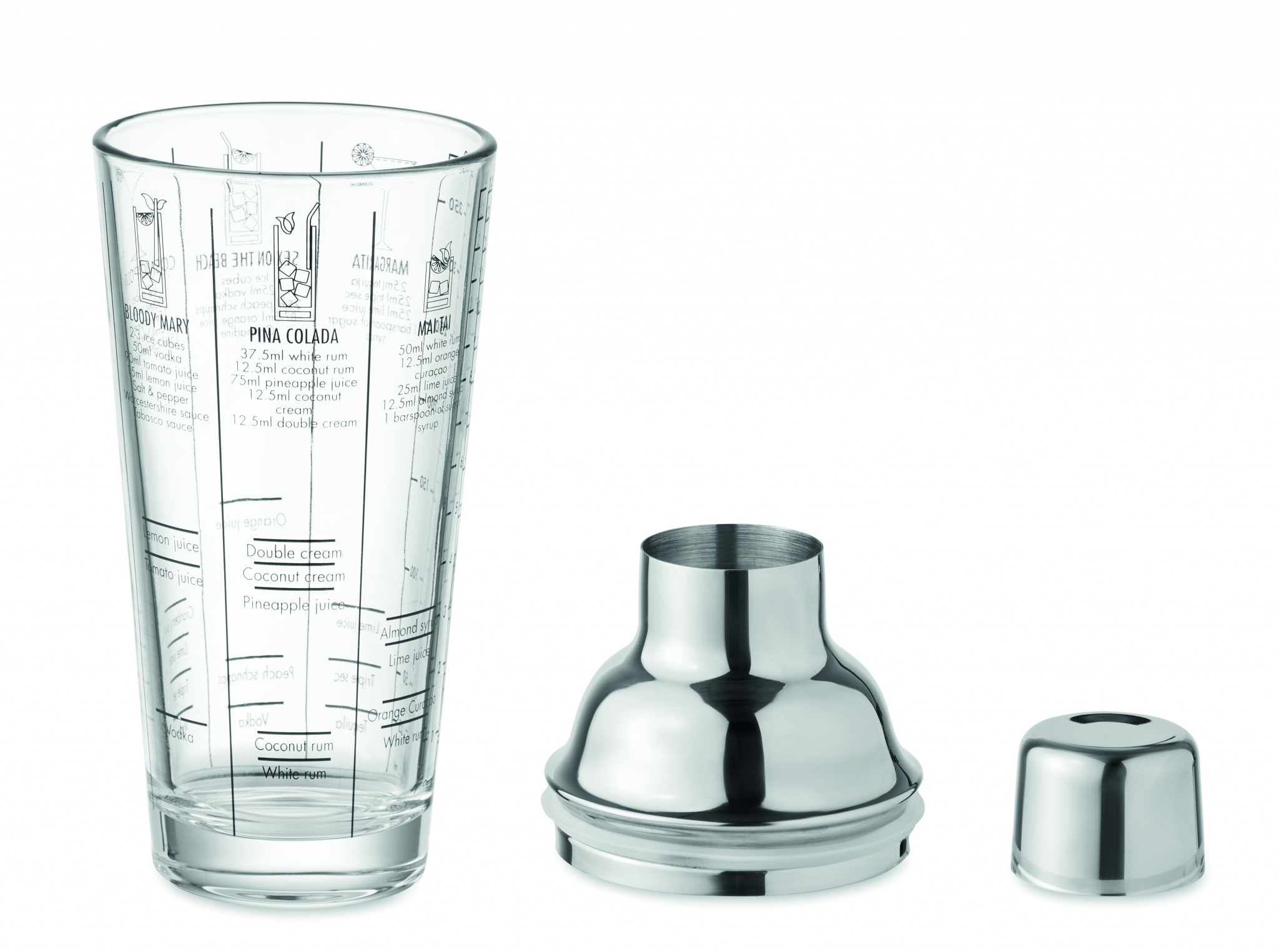 Roostevabast terasest kaanega klaasist kokteilišeiker koos kurnaga. Klaasile trükitud kokteiliretseptid ja mõõdud. Mahutavus: 400 ml.