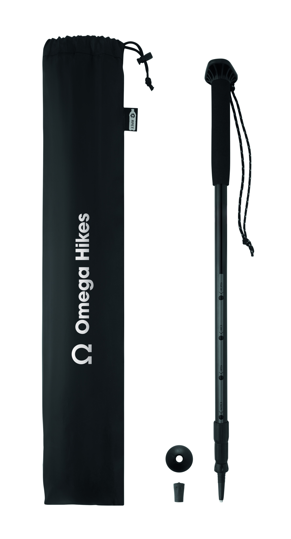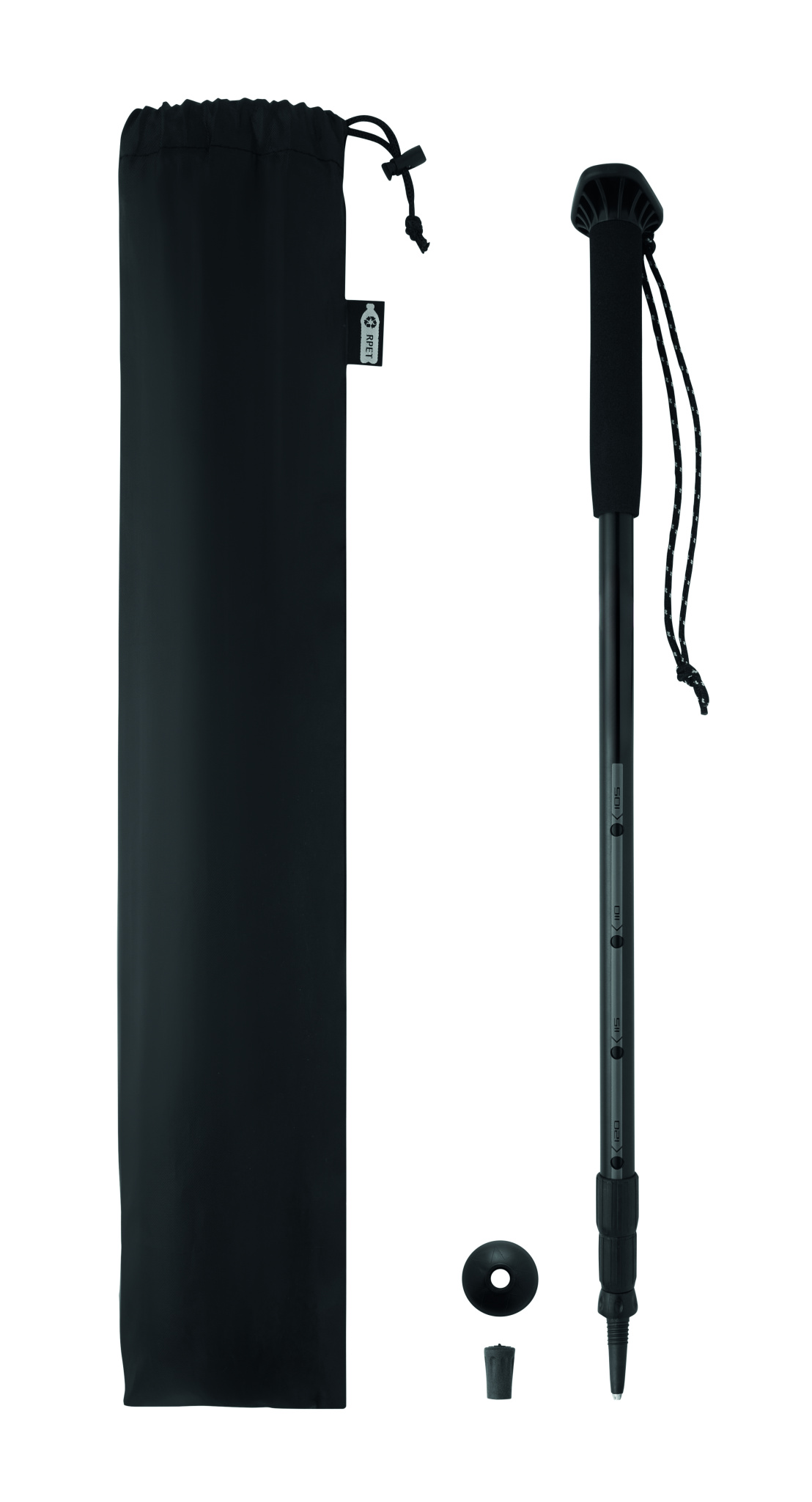 Käimiskepp EVA-käepide, randmepael, kummist ots. Reguleeritav pikkus 105–120 cm. Pakendatud RPET-nööriga kotis. Kerge ja vastupidav disain.