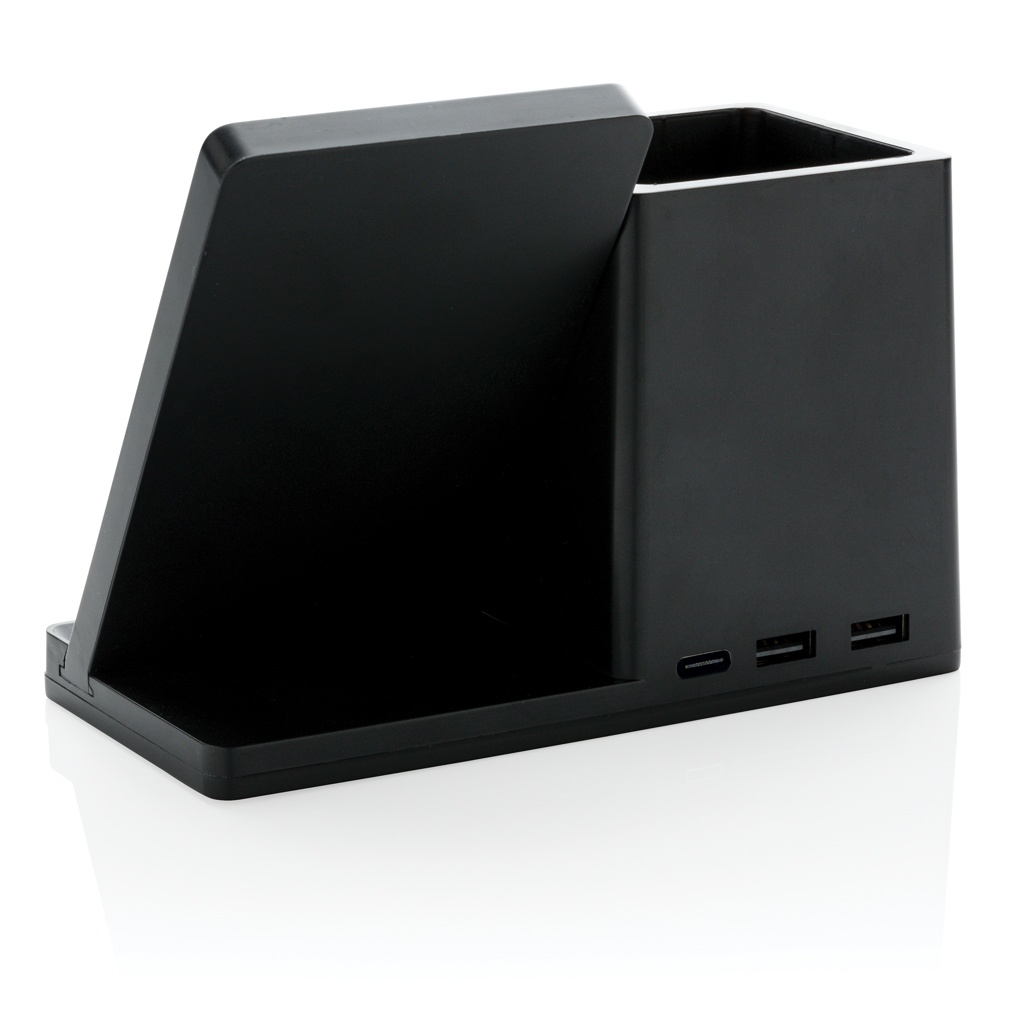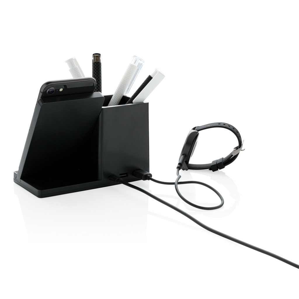 10 W kiire juhtmevaba laadija koos pliiatsihoidjaga, mis on valmistatud RCS (Recycled Claim Standard) sertifitseeritud taaskasutatud ABS-ist. Taaskasutatud kogusisaldus: 78% eseme kogukaalust. RCS-sertifikaat tagab taaskasutatud materjalide täielikult sertifitseeritud tarneahela. Bambusest FSC 100 bambusest valmistatud juhtmevaba laadimisala. Kahe USB-pordiga tagaküljel laadimiseks kaabli kaudu. Juhtmeta laadimine ühildub Androidi uusimate põlvkondade, iPhone 8 ja uuemate versioonidega. Toode ja tarvikud PVC-vaba. Kaasa arvatud 120 cm C-tüüpi laadimiskaabel, mis on valmistatud RCS-sertifikaadiga taaskasutatud TPE-st. Pakitud FSC mix kraft karpi. Type-C sisend 5V/2A; 9V/2A; Juhtmeta väljund 5V/1A;9V/1,1A; (10W) Registreeritud disain®