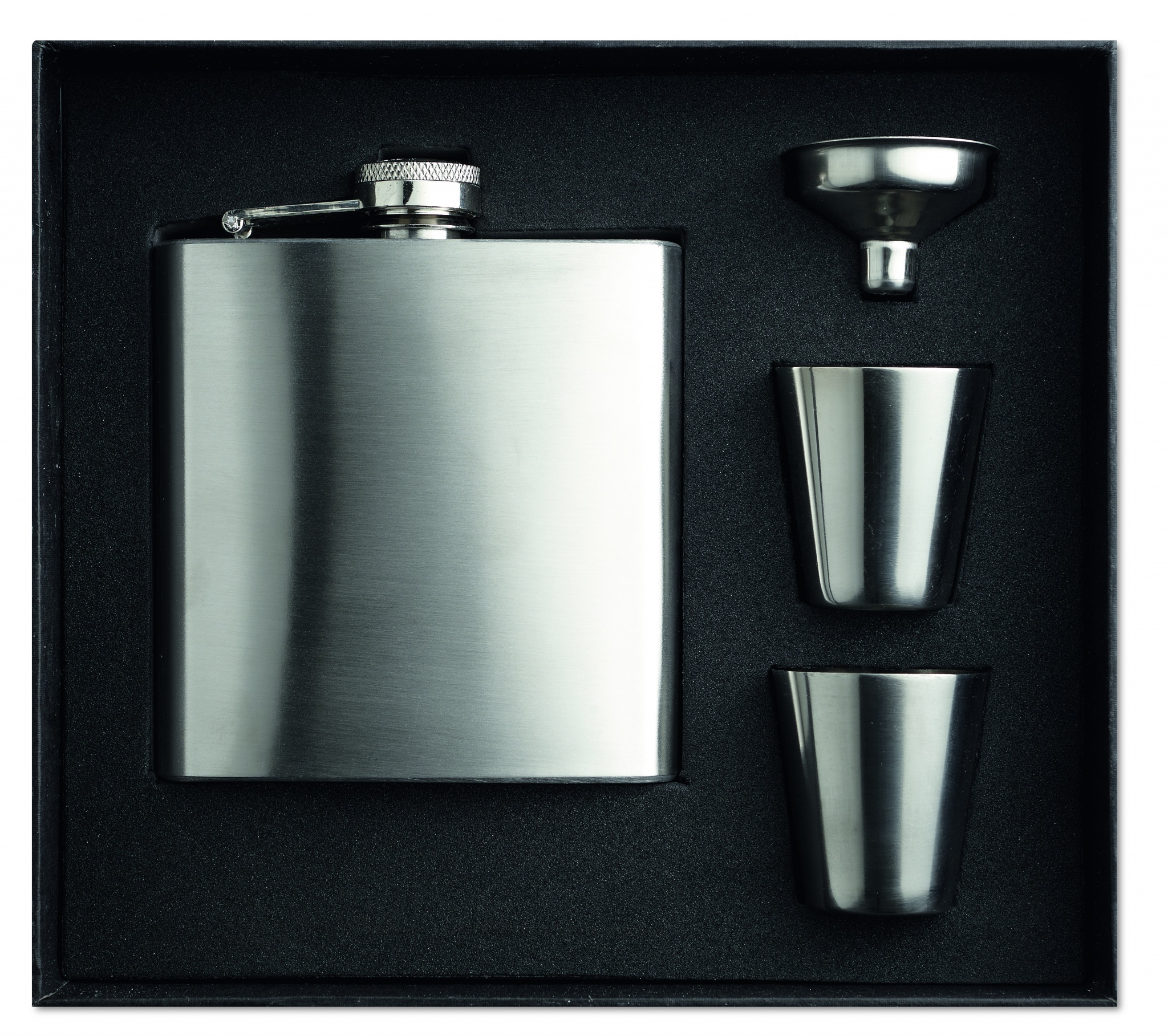 Õhuke puusa kolb. Satiinviimistlus, ühekihiline 175 ml. 2 tassi ja pudelikaelaga, mustas kinkekarbis.