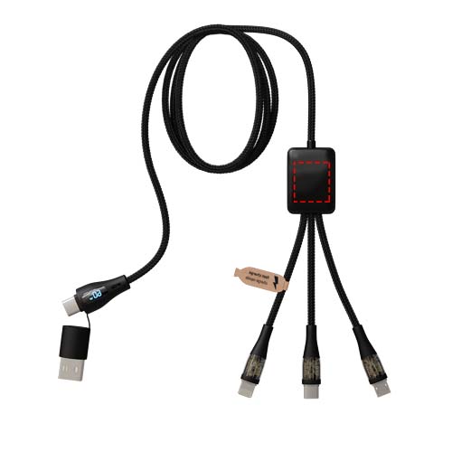 5-ühes 60W taaskasutatud PET-materjalist kiirlaadimiskaabel valgustatud kahepoolse logoga ja kolme pistikuga (Type-C, iPhone ja Android). Kahekordne USB-A + USB-C sisend muudab kaabli 100% ühilduvaks uusimate arvutimudelitega. Kaabliga saab laadida mitut seadet korraga. Tarnitakse taaskasutatava TPU-koti ja taaskasutatud paberist sisetükiga. Juhtme pikkus: 1 meeter.