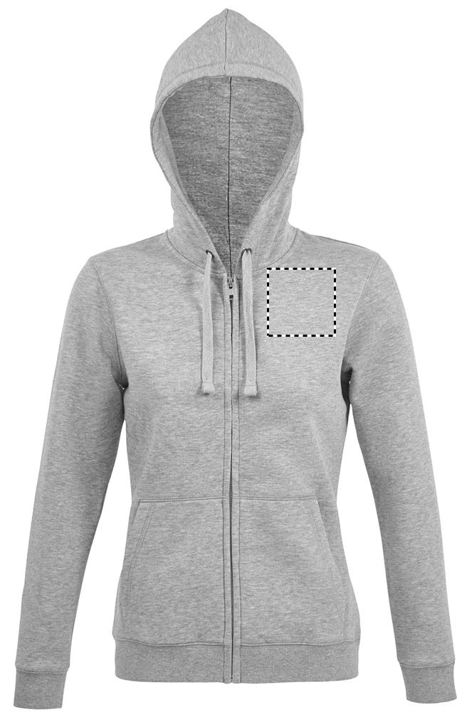 SOLI PIKE NAISED. Naiste tõmblukuga kapuutsiga pusa, 80% rõngaskedraga puuvill - 20% polüester Harjatud vooder, Väljast: 100% puuvill FLIIS 280 LSF (madala kokkutõmbumisega kangas), Sisseehitavad varrukad, 2 kotitaskut ees, Lõige ja õmmeldud, Voodriga kapuuts koos tooniga -tooniga nöör, 2x2 sooniku mansetid ja alläär. Krae sees poolkuu, teibitud kael, YKK tõmblukk. ÖKO-TEX®. Müüakse ainult trükiga.
