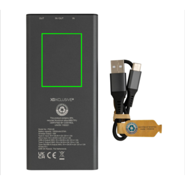 Ülikiire laadimise aku, mis on valmistatud RCS-i (Recycled Claim Standard) sertifitseeritud taaskasutatud alumiiniumist ja ABS-ist. Taaskasutatud kogusisaldus: 28% kauba kogukaalust. RCS-sertifikaat tagab taaskasutatud materjalide täielikult sertifitseeritud tarneahela. Alumiinium ei kaota ringlussevõtu käigus oma omadusi ja seda saab ringlusse võtta lõputult. Akupank sisaldab kauakestvat A-klassi 10 000 mAh liitiumpolümeerakut. C-väljundport toetab kiiret laadimist kuni 18 W ja ka kiiret uuesti laadimist 3 tunni jooksul. Juhtmeta laadija toetab juhtmevaba laadimist kuni 10 W. Toiteindikaatorid näitavad järelejäänud energiataset, nii et teate alati, millal laadida. Toode ja tarvikud 100% PVC-vaba. Sisaldab C-tüüpi laadimiskaablit, mis on valmistatud RCS-sertifikaadiga taaskasutatud alumiiniumist, TPE-st ja PET-st. Pakitud FSC® segupakendisse. USB väljund 5/3A, 9V/2A. 12V/1,5A. C-tüüpi väljund: 5V/3A, 9V/2A, 12V/1,5A. C-tüüpi sisend: 5V/3A, 9V/2A, 12V/1,5A. Mikro-USB sisend: 5V/2A, 9V/2A, 12V/1,5A.