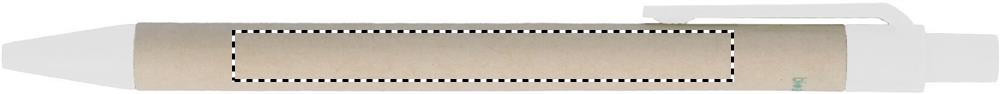 A5-muistikirja, jossa on kova kierrätyskartonkikansi. 160 viivoitettua sivua (80 arkkia kierrätyspaperia). Joustava sulkuhihna ja kynälenkki, nauhallinen kirjanmerkki. Mukana painonappikuulakynä, jonka runko on kierrätyspaperia. Sininen muste.