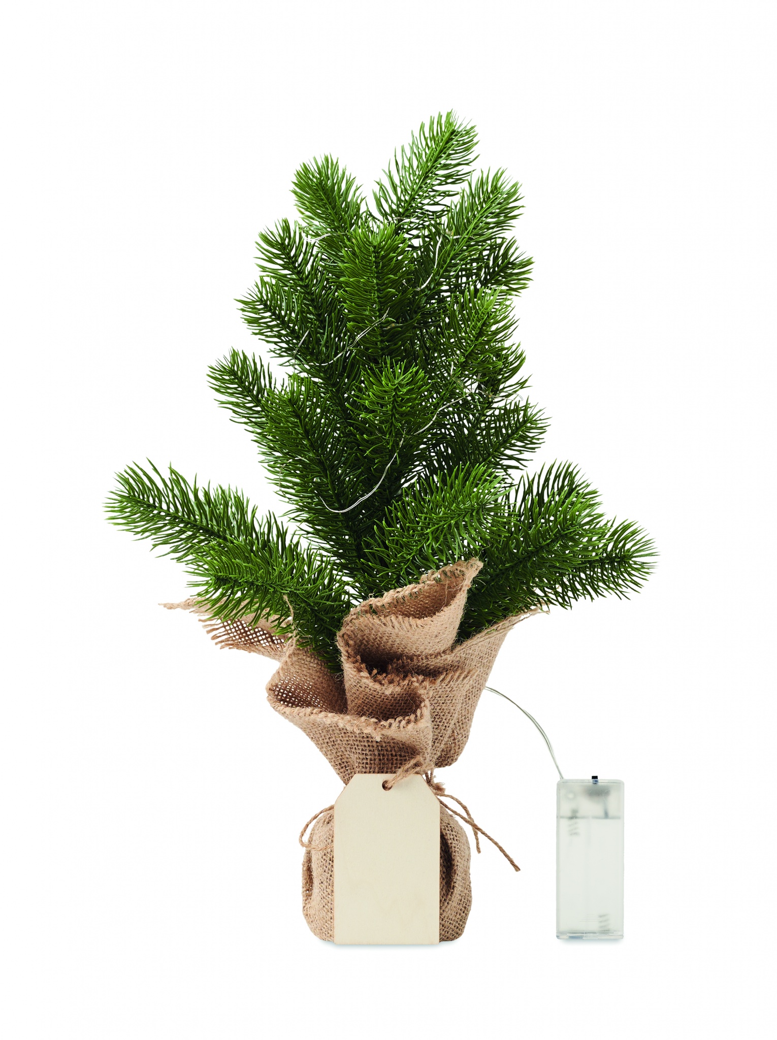 Mini tekojoulukuusi 20 LED- lämpimänkeltaisella valolla juuttikangasjalustalla. Mukana puinen lahjalappu ja 2 AA paristoa ei sisälly toimitukseen.