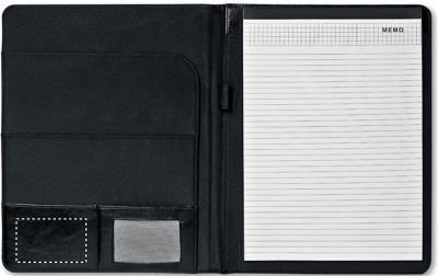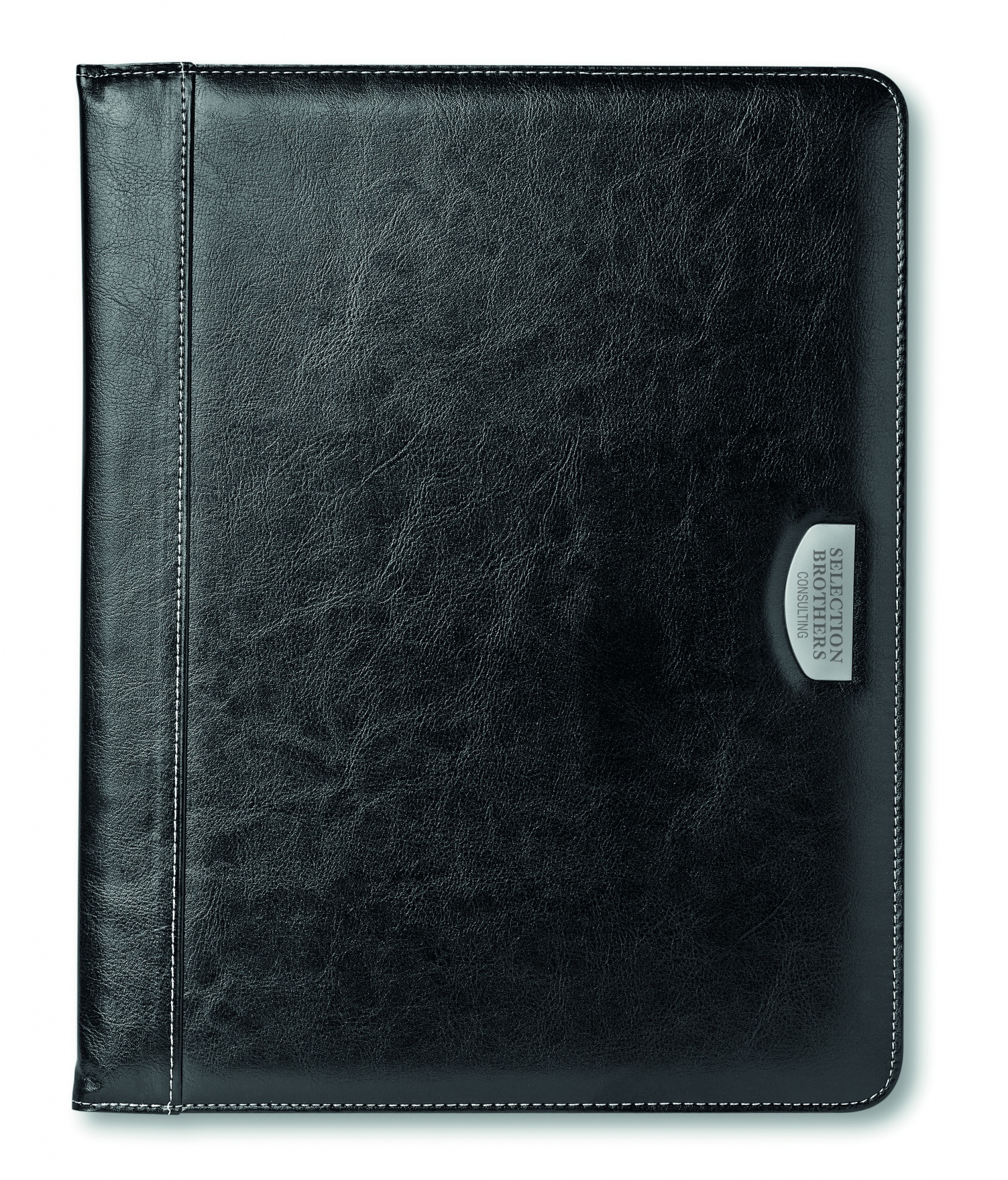 A4 PU kansio, kannessa metallilaatta kaiverrusta varten. Sisältää 20 sivuisen muistilehtiön.