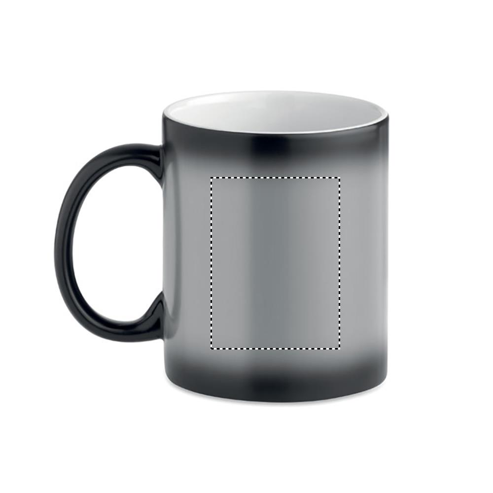 Keraaminen muki 300 ml, erikoispinnoite sublimaatiota varten. Muki muuttaa väriä ja tuo esiin painatuksen, kaadettaessa mukiin (vähintään) 50 ° C lämpöistä nestettä. Yksittäispakattuna valkoiseen pahvilaatikkoon.