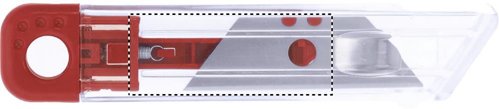 Uudelleen sisäänvedettävä mattoveitsi. Läpinäkyvä runko ja värikkäät yksityiskohdat.