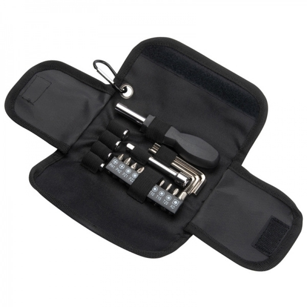 Työkalusarja koostuu ruuvimeisselistä erilaisilla muttereilla ja kärjillä, jatkokappaleesta ja kolmesta erikokoisesta kuusikulmaisesta avaimesta sekä käytännöllisestä taskusta, jossa on kiinnityskoukut, johon painamme logosi. Setti on pakattu yksittäin polybagiin.